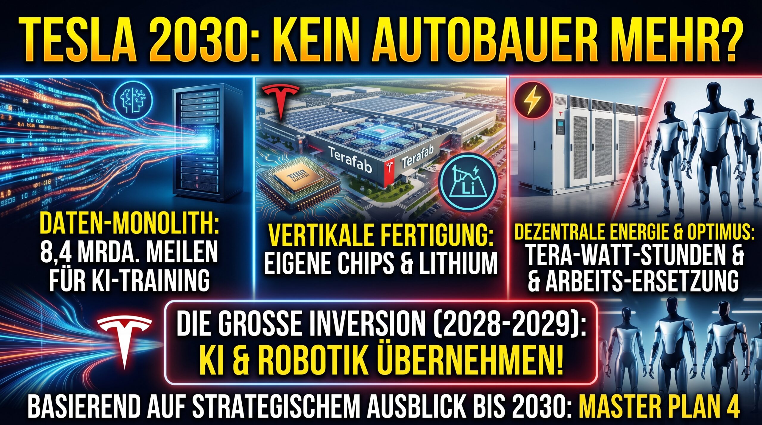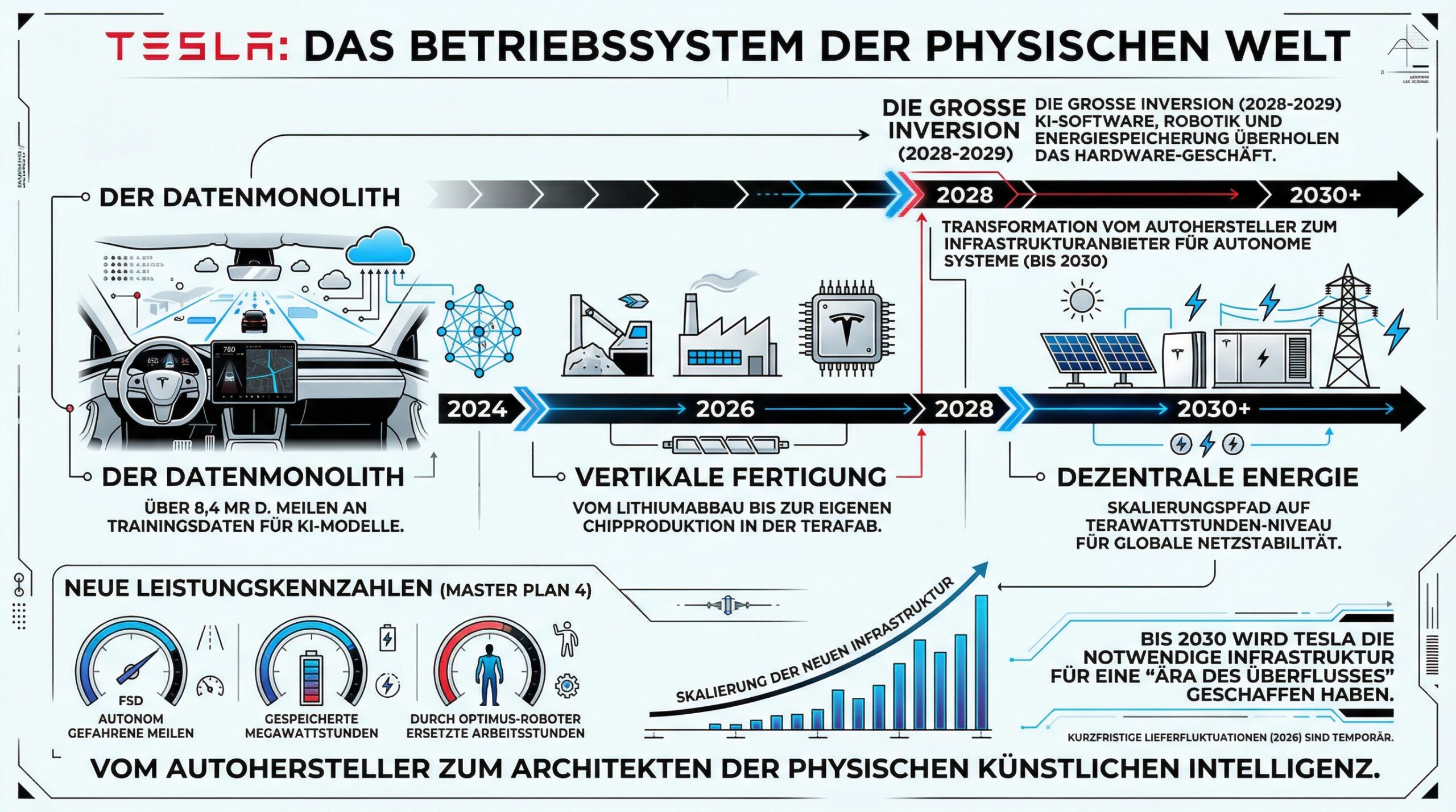 Bis zum Jahr 2030 wird sich Tesla von einem Automobilhersteller zu einem Infrastruktur-Provider für autonome Systeme transformiert haben. Die “Große Inversion” – der Moment, in dem KI-Software, Robotik und Energiespeicherung das klassische Hardware-Geschäft überholen – ist für den Zeitraum 2028-2029 zu erwarten.