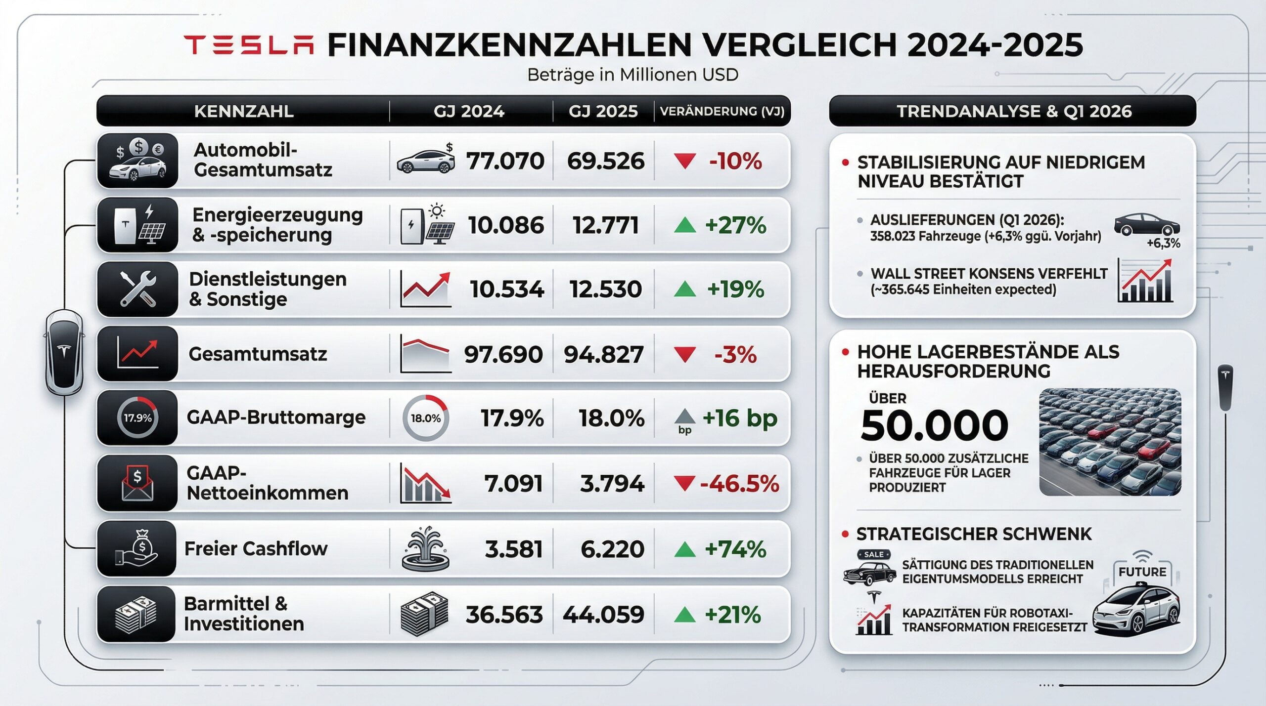Die Geschäftsjahre 2024 und 2025 verdeutlichen die Herausforderungen im globalen Elektrofahrzeugmarkt (EV). Der Gesamtumsatz sank im Jahr 2025 um 2,93 % auf 94,827 Mrd. USD, was primär auf einen Rückgang der Automobilumsätze um 10 % zurückzuführen ist. Der GAAP-Nettogewinn verzeichnete einen Einbruch um 46,5 % auf 3,794 Mrd. USD, was die intensive Preiskonkurrenz und die massiven Forschungs- und Entwicklungsausgaben für KI-Projekte widerspiegelt. Dennoch konnte Tesla seine Cash-Position durch einen starken Free Cash Flow von 6,22 Mrd. USD auf insgesamt 44,1 Mrd. USD ausbauen, was das notwendige Kapital für die nächste Wachstumsphase bereitstellt.