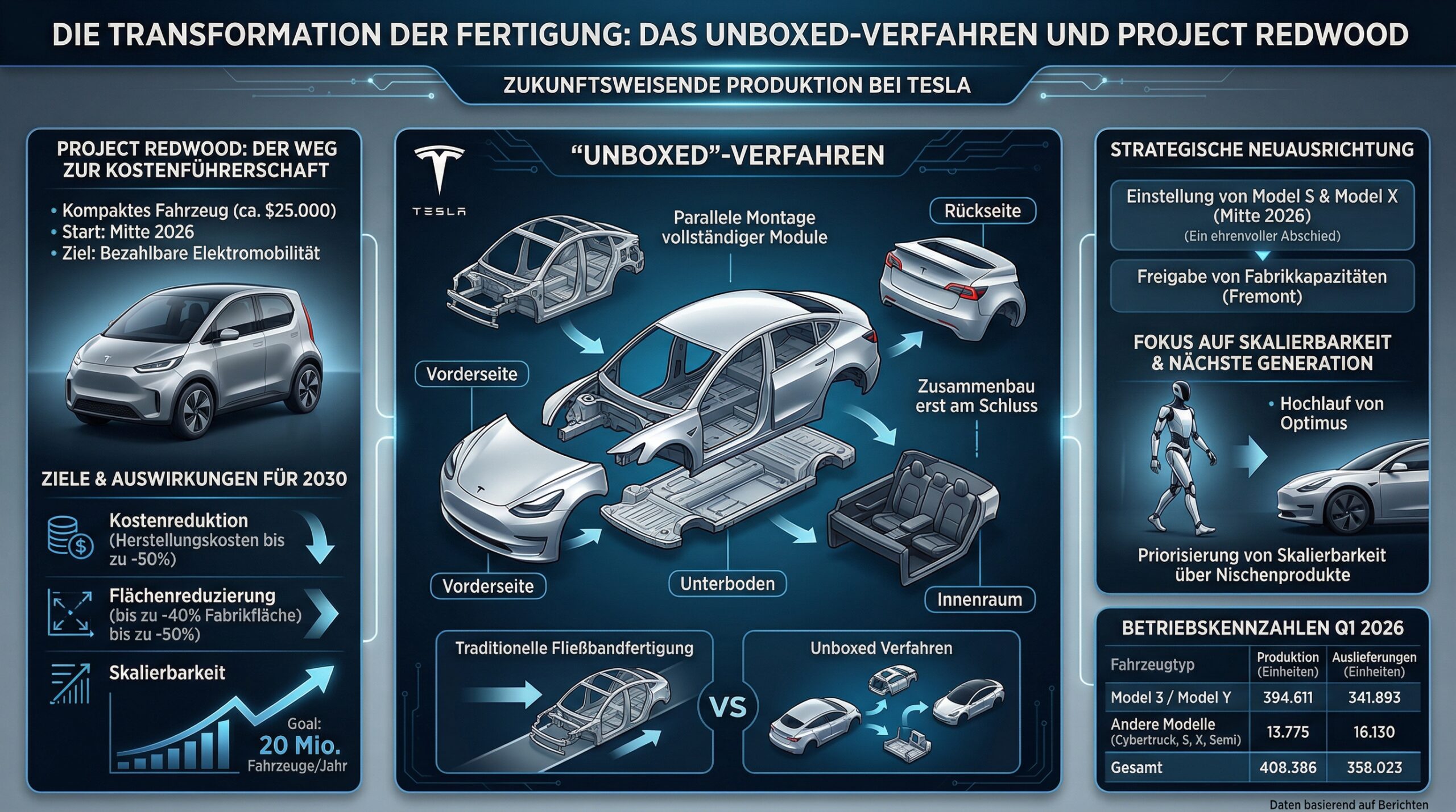 Um die Kostenführerschaft im Massenmarkt zurückzugewinnen, setzt Tesla ab Mitte 2026 auf das “Project Redwood”, ein kompaktes Fahrzeug für ca. 25.000 USD. Die technologische Grundlage bildet der revolutionäre “Unboxed”-Fertigungsprozess. Im Gegensatz zur traditionellen Fließbandfertigung, bei der das Fahrzeug skelettartig durch die Fabrik wandert, werden beim Unboxed-Verfahren separate Module (Vorderseite, Rückseite, Unterseite, Innenraum) parallel fertiggestellt und erst im finalen Schritt zusammengefügt.