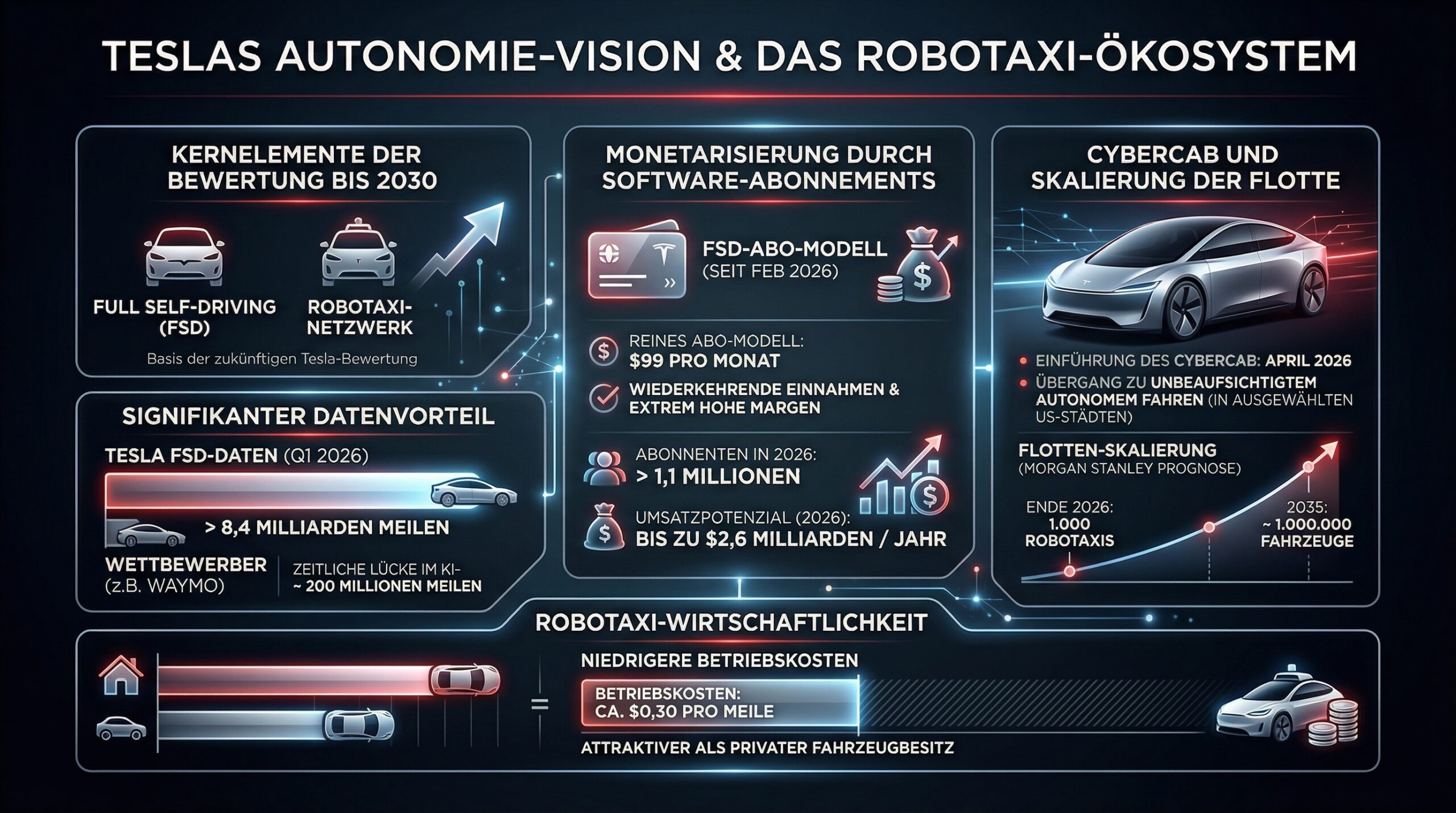 Die Einführung des Cybercab im April 2026 markiert den Übergang zum unüberwachten autonomen Fahren in ausgewählten US-Städten. Morgan Stanley prognostiziert eine Flottengröße von 1.000 Robotaxis bis Ende 2026, mit einem Skalierungspfad auf eine Million Fahrzeuge bis 2035. Die Betriebskosten werden auf ca. 0,30 USD pro Meile geschätzt, was das Robotaxi-Modell ökonomisch attraktiver macht als den privaten Fahrzeugbesitz.