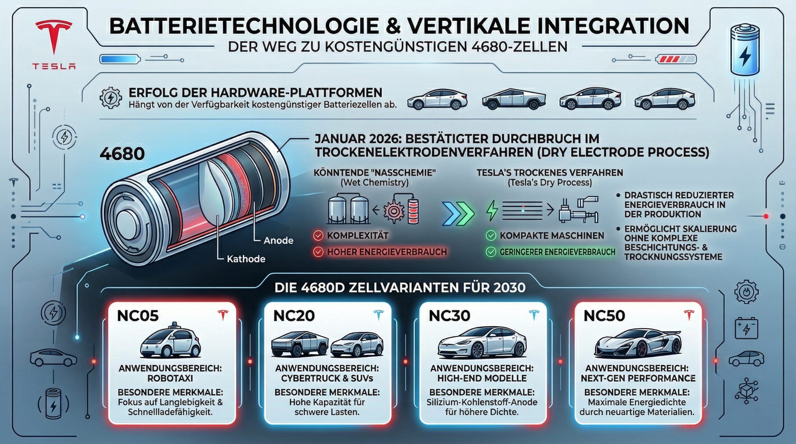 Der Erfolg der Hardware-Plattformen hängt maßgeblich von der Verfügbarkeit kostengünstiger Batteriezellen ab. Im Januar 2026 bestätigte Tesla den Durchbruch beim Trockenelektroden-Verfahren für sowohl die Anode als auch die Kathode der 4680-Zelle. Dieses Verfahren reduziert den Energieverbrauch in der Produktion drastisch und ermöglicht eine Skalierung ohne die komplexen Beschichtungs- und Trocknungsanlagen der herkömmlichen “Nass”-Chemie.