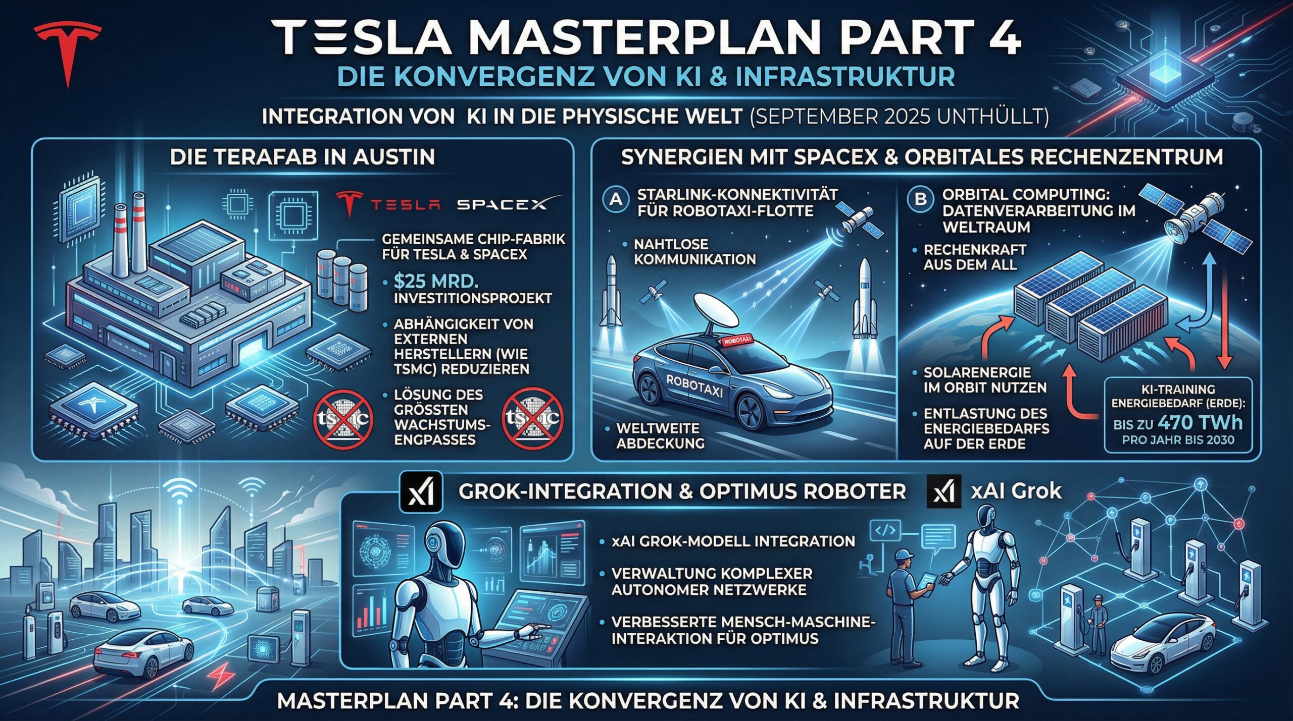 Die im September 2025 vorgestellte vierte Stufe des Masterplans sieht eine vollständige Integration von KI in die physische Welt vor. Ein zentrales Element ist die Errichtung einer “Terafab” in Austin, einer gemeinsamen Chip-Fabrik für Tesla und SpaceX. Dieses 25-Milliarden-Dollar-Projekt soll die Abhängigkeit von externen Halbleiterherstellern wie TSMC verringern, die Musk als das größte Wachstumsnadelöhr der nächsten Jahre identifiziert hat.