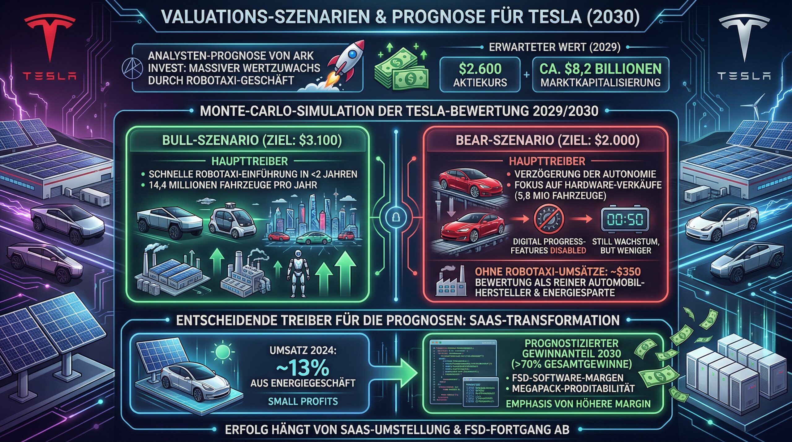Analysten wie Ark Invest projizieren für Tesla bis zum Ende des Jahrzehnts eine massive Wertsteigerung, die primär durch das Robotaxi-Geschäft getrieben wird. Im “Expected Value” Modell für 2029 wird ein Aktienkurs von 2.600 USD bei einer Marktkapitalisierung von ca. 8,2 Billionen USD erwartet.