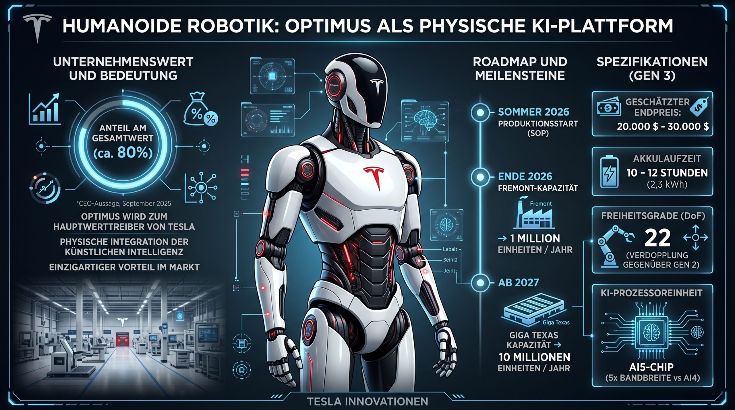 Ein signifikanter Teil des zukünftigen Unternehmenswertes wird dem humanoiden Roboter Optimus zugeschrieben. Elon Musk betonte im September 2025, dass Optimus etwa 80 % des Gesamtwertes von Tesla ausmachen werde. Die Massenproduktion des Optimus Gen 3 soll im Sommer 2026 beginnen, wobei das Werk Fremont eine Kapazität von einer Million Einheiten pro Jahr anstrebt.