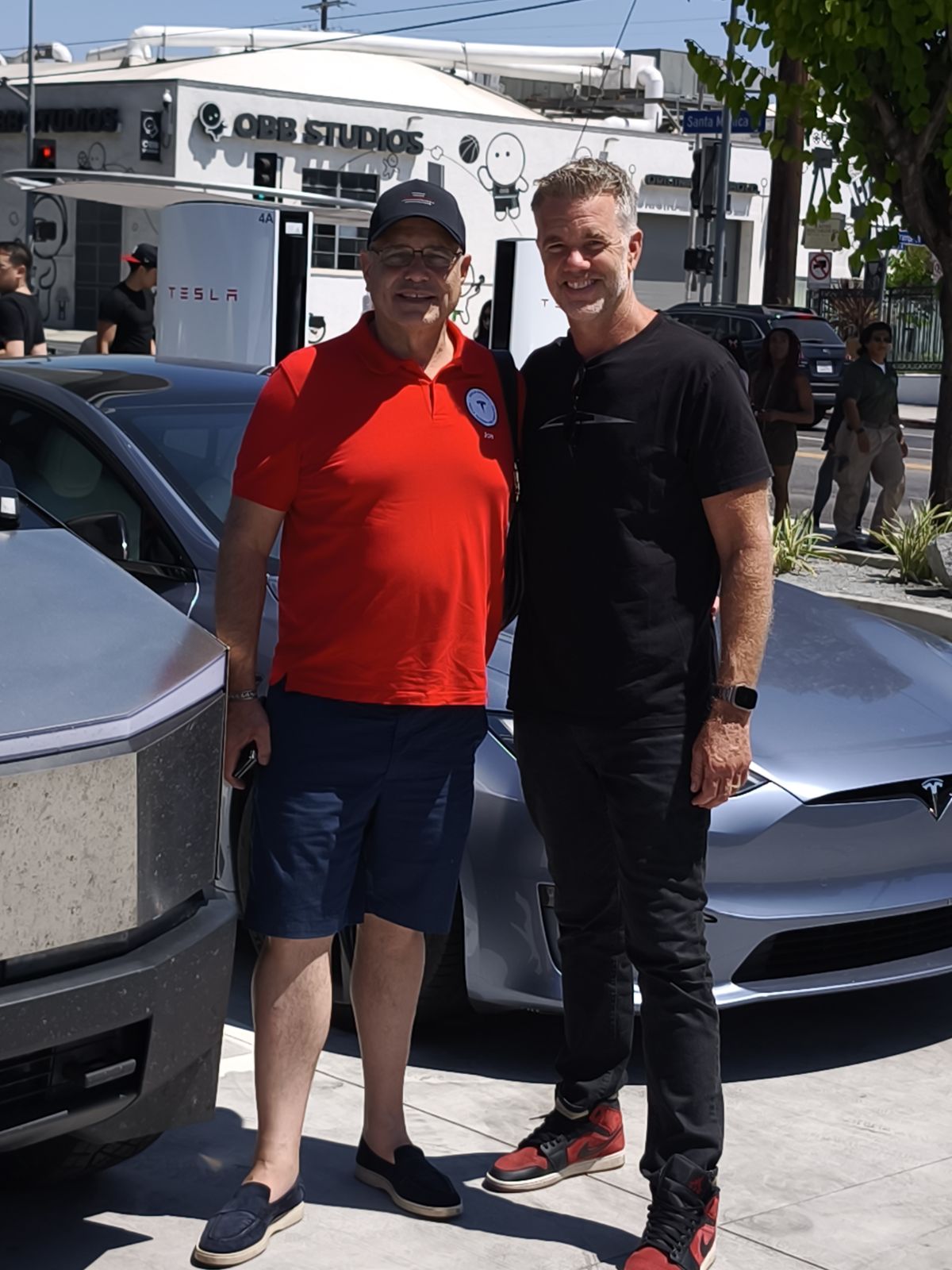 Sir Ralf Waitschies, der mit seiner Reisegruppe sowohl beim XTakeover, als auch bei der Boring Company, Giga Austin und ein paar Tage vor uns im Tesla Diner war, hatte uns ein Bild geschickt, so dass ich beim Aufbau der TFF Beachflag merkte, dass das Model S von Franz von Holzhausen (Chefdesigner von Tesla) neben uns stand. Als Eva ihn noch entdeckte, sprachen wir ihn an und erzählten ihm von unserer Tour. Der Titel der weitesten Autoanreise war uns somit gewiss. Ebenso seine volle Hochachtung wozu „sein Model S Plaid“ auf der deutschen Autobahn fähig ist. Den Film mit der Beschleunigung auf 328 km/h wollte er sofort ein 2. Mal sehen.