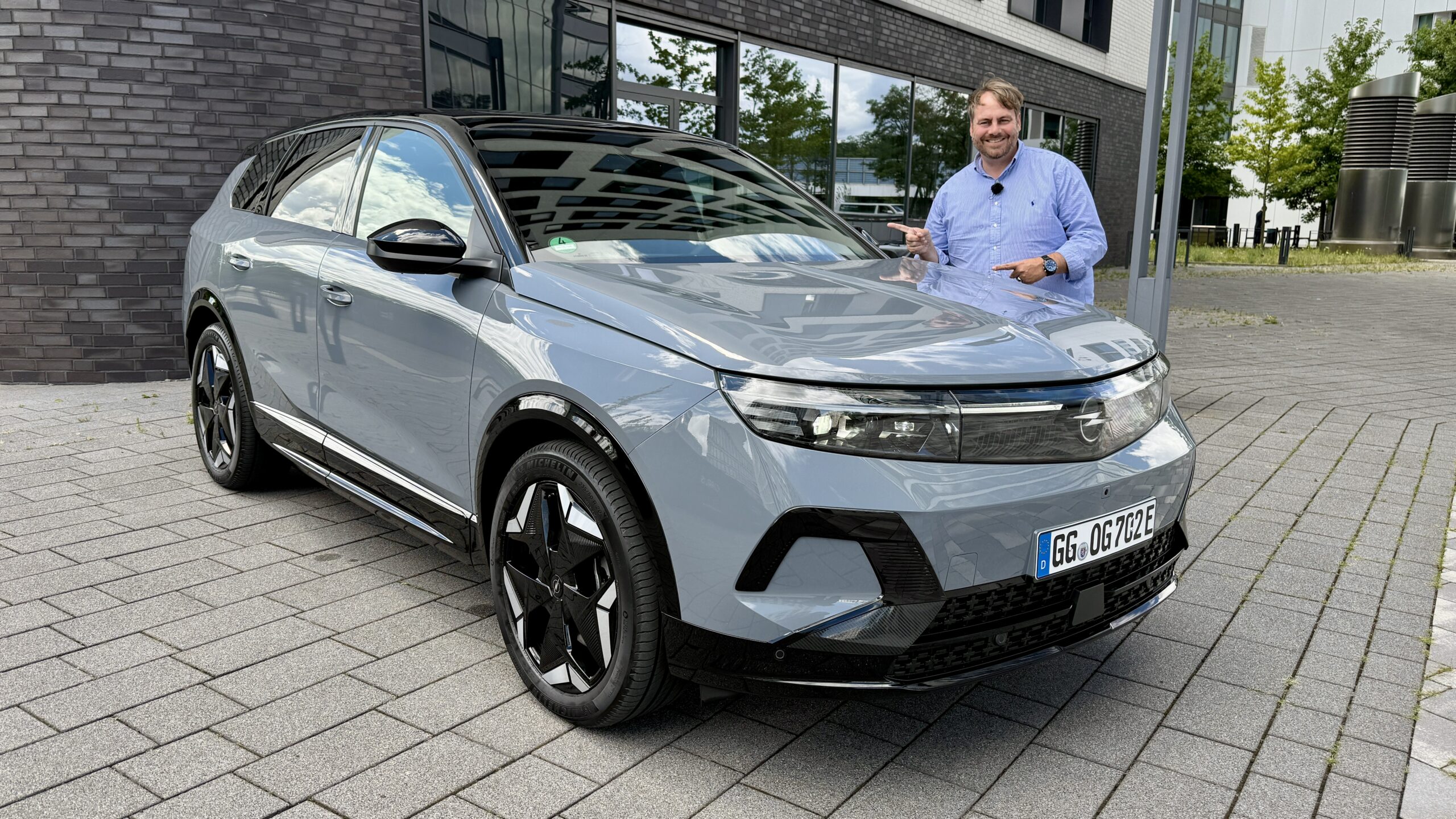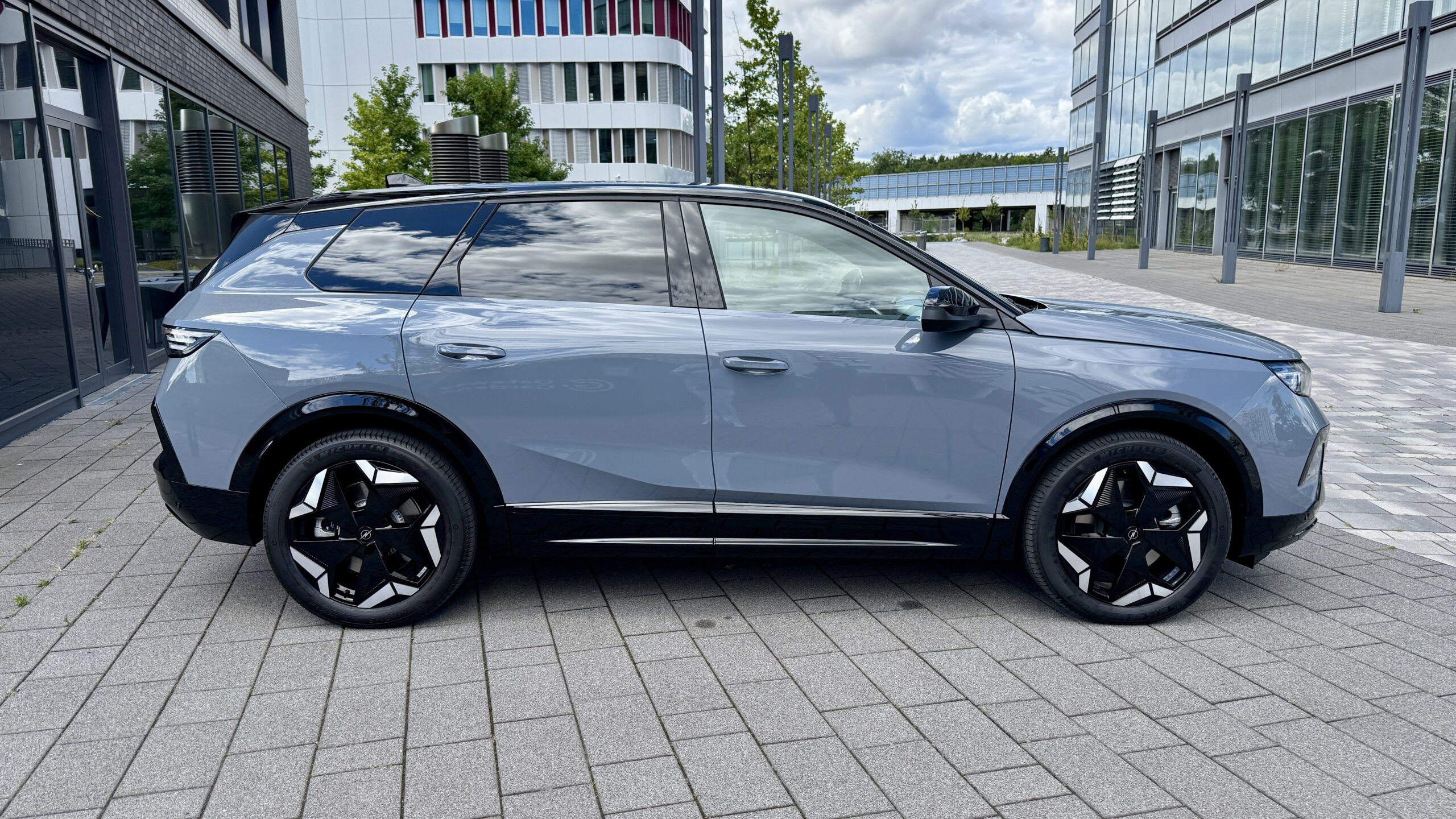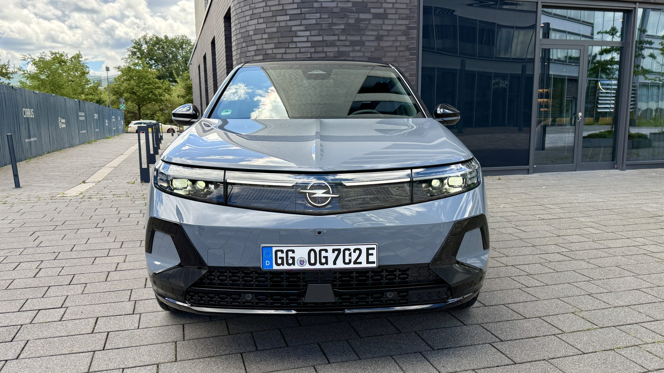 Die Front ist markant, wirkt modern mit dem beleuchteten Opel-Blitz und scharfem Tagfahrlicht. Auffällig: Die matten Farbakzente und schwarzen Designelemente, gerade die schwarzen Dachspangen und Spiegel.