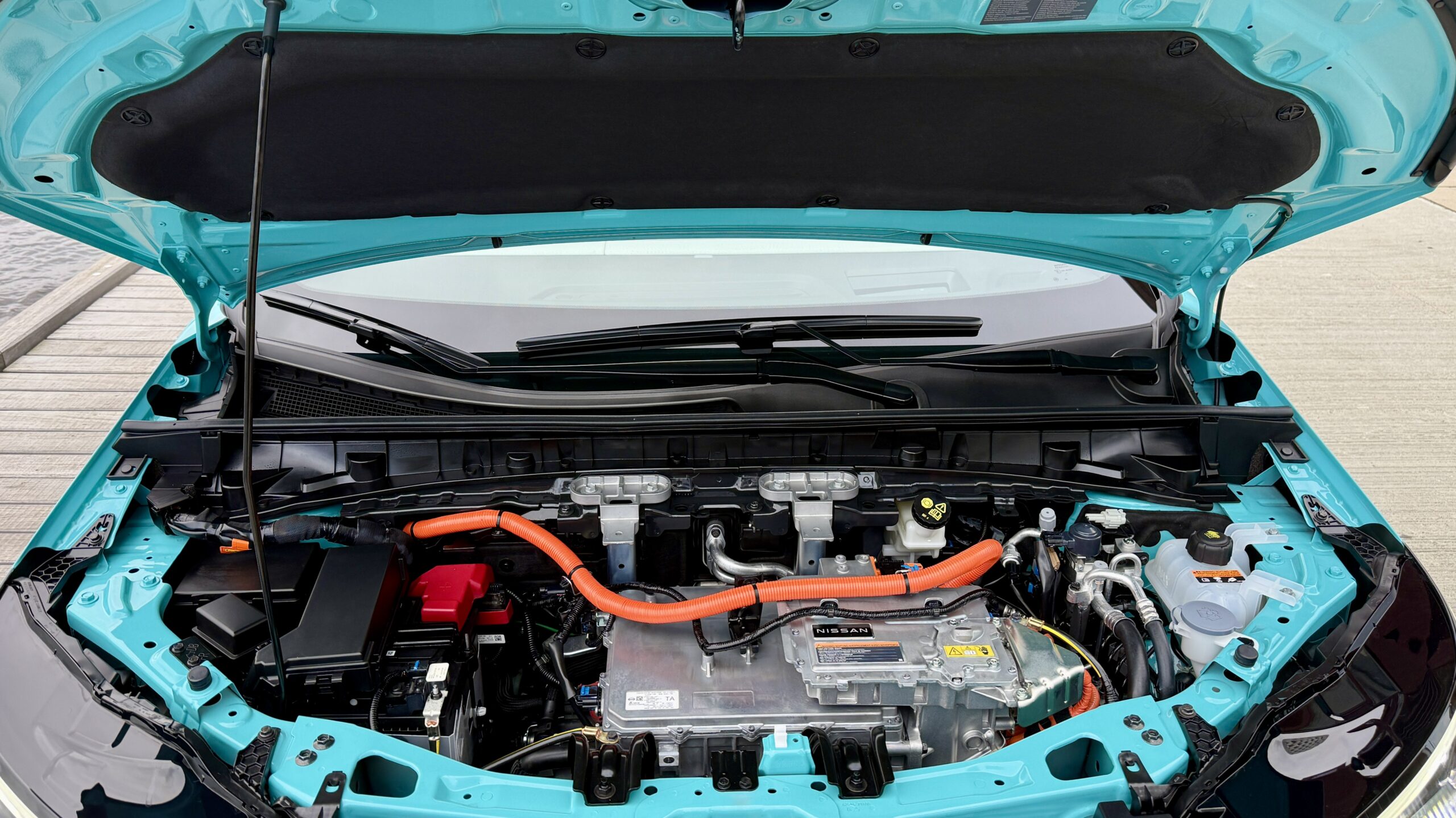 Bevor wir über Technik sprechen, ein kurzer Blick unter die Haube. Und genau da zeigt sich die erste Überraschung: kein Frunk. Während viele Konkurrenten hier zusätzlichen Stauraum bieten, bleibt beim Leaf nur der Blick auf den Elektromotor, das Ladegerät und die 12-Volt-Batterie.
