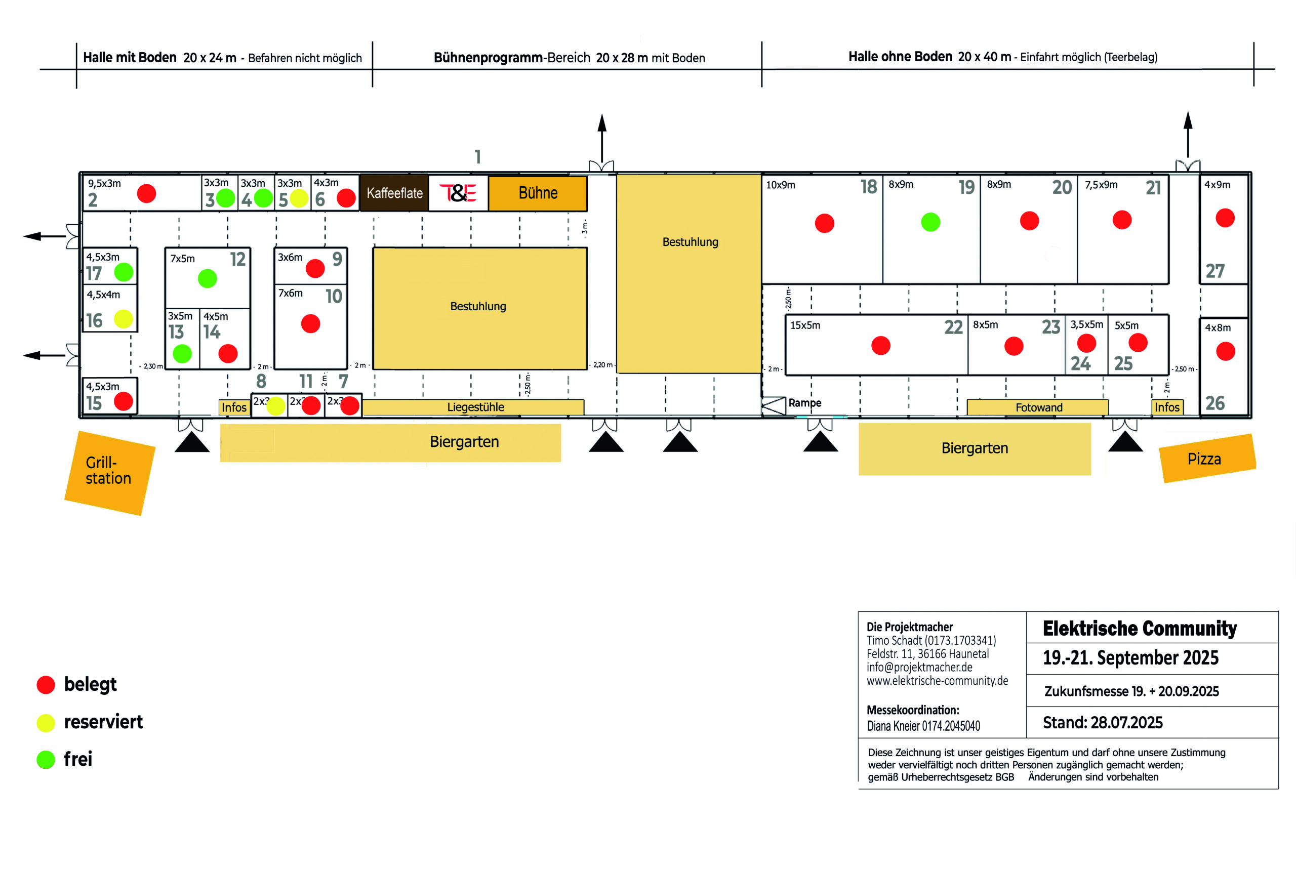 Aussteller im Bereich E-Autos und regenerative Energien können sich, ihre Produkte und Dienstleistungen auf dem weitläufigen Gelände präsentieren. Wer möchte kann auch im 1.920 Quadratmeter (96 x 20 Meter) großen Messezelt einen der limitierten Plätze dafür nutzen. Hierin befindet sich auch die Veranstaltungsbühne. Hier wird am Vorabend des Hauptevents, am 19. September 2025 die E-Zukunftsmesse zu E-Mobilität & erneuerbaren Energien um 18.00 Uhr offiziell eröffnet. Sie wird an diesem Tag bis 19.30 Uhr für einen ersten Messerundgang zugänglich sein und am Folgetag zwischen 9.00 Uhr und 18.30 Uhr viel Interessantes bieten.