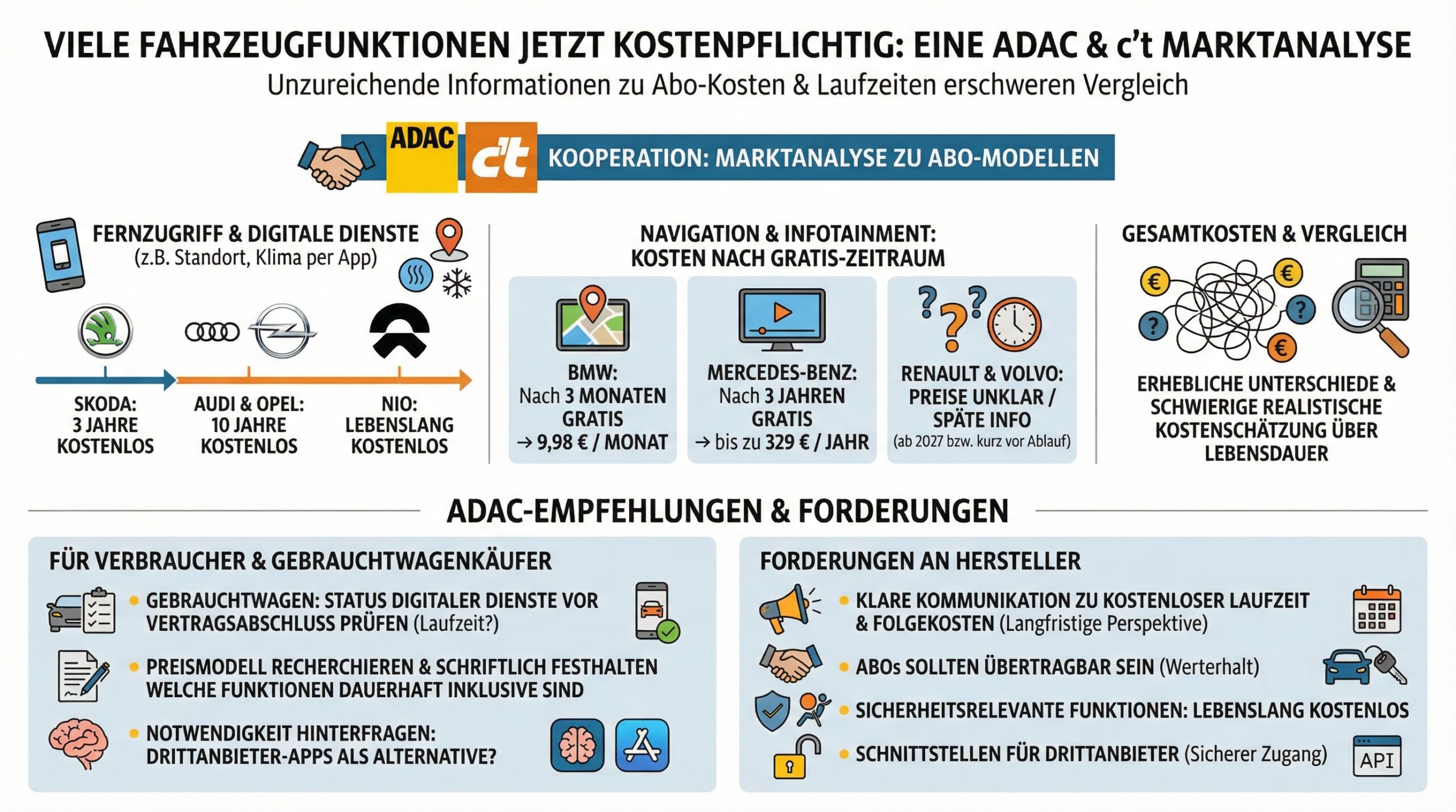Datenzugriff, Navigation, Infotainment: Viele Funktionen in Fahrzeugen sind heute nur noch gegen Bezahlung verfügbar. Der ADAC hat in Kooperation mit der Fachzeitschrift c’t eine Marktanalyse zu den verschiedenen Abo-Modellen durchgeführt und stellt fest: Verbraucher werden oft nicht ausreichend über die Kosten und die Laufzeiten aufgeklärt. Zudem verfolgt fast jeder Hersteller eine individuelle Strategie, was die Vergleichbarkeit erschwert.