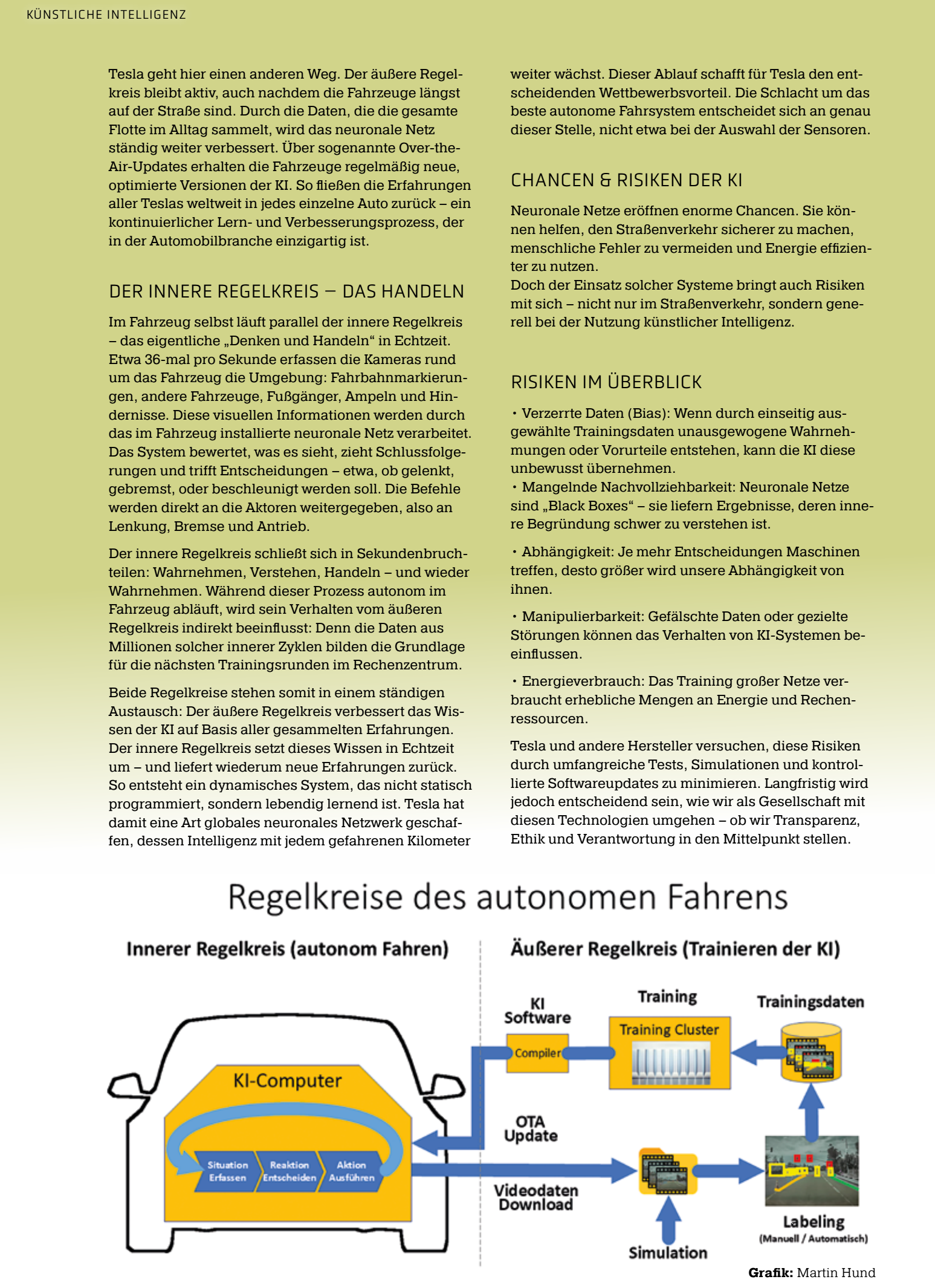 Tesla geht hier einen anderen Weg. Der äußere Regelkreis bleibt aktiv, auch nachdem die Fahrzeuge längst auf der Straße sind. Durch die Daten, die die gesamte Flotte im Alltag sammelt, wird das neuronale Netz ständig weiter verbessert. Über sogenannte Over-the-Air-Updates erhalten die Fahrzeuge regelmäßig neue, optimierte Versionen der KI. So fließen die Erfahrungen aller Teslas weltweit in jedes einzelne Auto zurück – ein kontinuierlicher Lern- und Verbesserungsprozess, der in der Automobilbranche einzigartig ist.