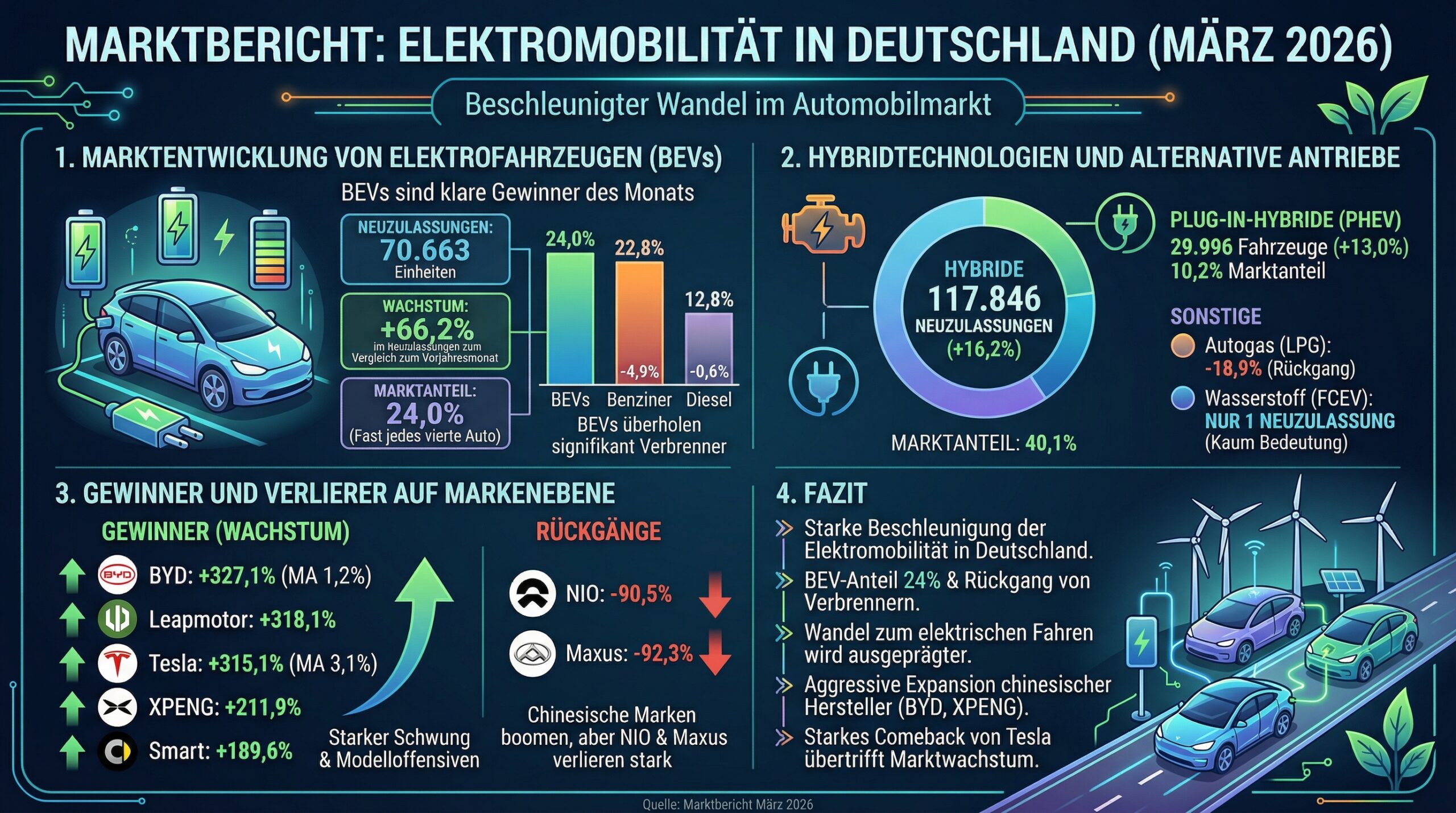 Der März 2026 belegt eine starke Beschleunigung der Elektromobilität in Deutschland. Mit einem BEV-Anteil von 24 % und einem gleichzeitigen Rückgang der Verbrenner festigt sich der Wandel zum elektrischen Fahren. Besonders auffallend ist die aggressive Expansion chinesischer Hersteller (BYD, XPENG) sowie das starke Comeback von Tesla, die das Marktwachstum weit übertreffen.