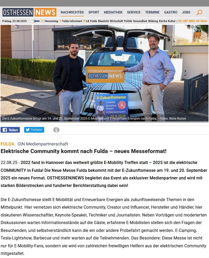 Um die Veranstaltung elektrische COMMUNITY (19. bis 21. Sept. in Fulda) und insbesondere die E-Zukunftsmesse auch für die lokale Bevölkerung attraktiv zu machen hat Veranstalter Timo Schadt eine Medienpartnerschaft mit Osthessen.news geschlossen.