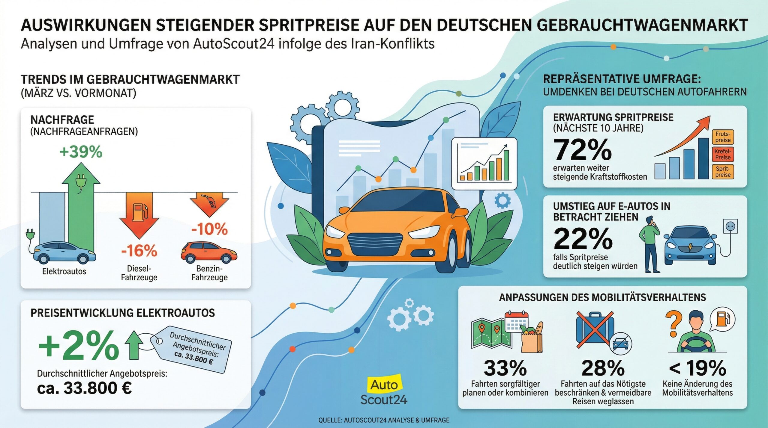 Die Auswertung basiert auf den Preis-, Angebots- und Nachfragedaten von AutoScout24 in Deutschland im März 2026 im Vergleich zum Vormonat Februar 2026. Die Nachfrage wird auf Basis tatsächlicher Kaufanfragen auf der Plattform gemessen.