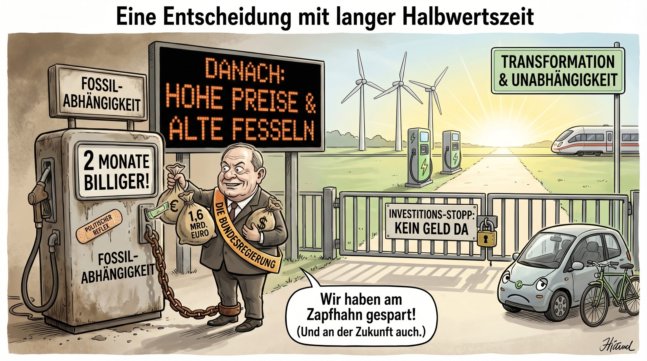 Das Kraftstoffmaßnahmenpaket der Bundesregierung ist verständlich als politischer Reflex. Es ist akzeptabel als kurzfristiger Puffer für die, die keine Alternative haben. Aber es ist falsch als Strategie, weil es die Transformationslogik unterläuft, fossile Abhängigkeit konserviert und 1,6 Milliarden Euro in ein System pumpt, das Deutschland langfristig vulnerabler macht.