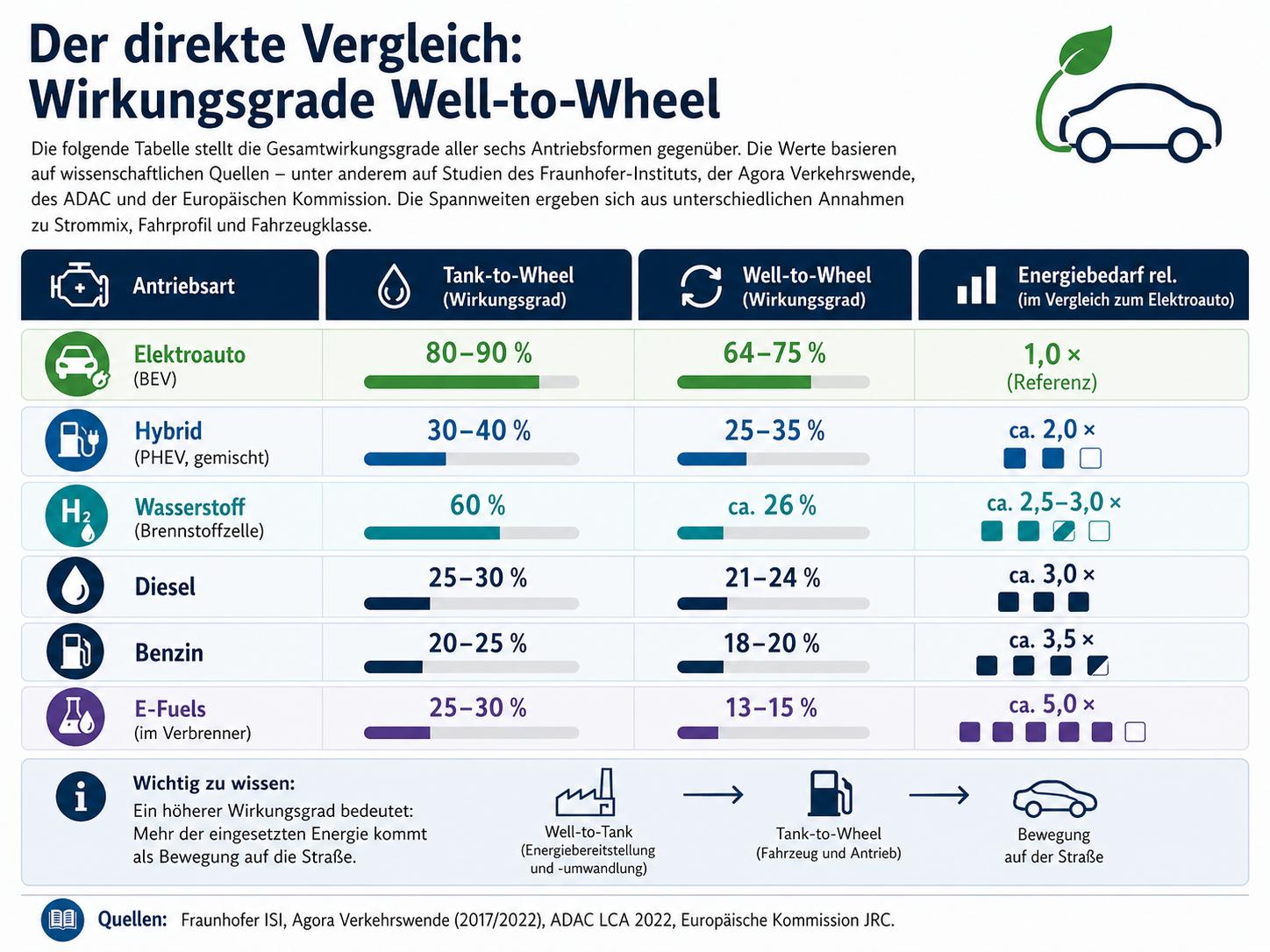 Der Vergleich zeigt eine klare Hierarchie: Das Batterie-Elektroauto ist mit deutlichem Abstand die effizienteste Antriebsform für den Pkw-Bereich. Wasserstoff und E-Fuels haben ihre Anwendungsfelder — aber nicht im Massenmarkt der Personenmobilität. Diesel und Benzin werden im Bestand noch eine Weile relevant bleiben, aber als Neuwagentechnologie haben sie ihre Zukunft hinter sich.