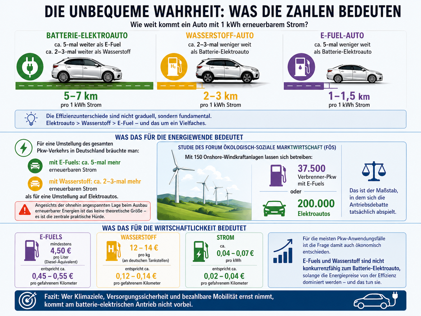 Für die meisten Pkw-Anwendungsfälle ist die Frage damit auch ökonomisch entschieden. E-Fuels und Wasserstoff sind nicht konkurrenzfähig zum Batterie-Elektroauto, solange die Energiepreise von der Effizienz dominiert werden — und das tun sie.