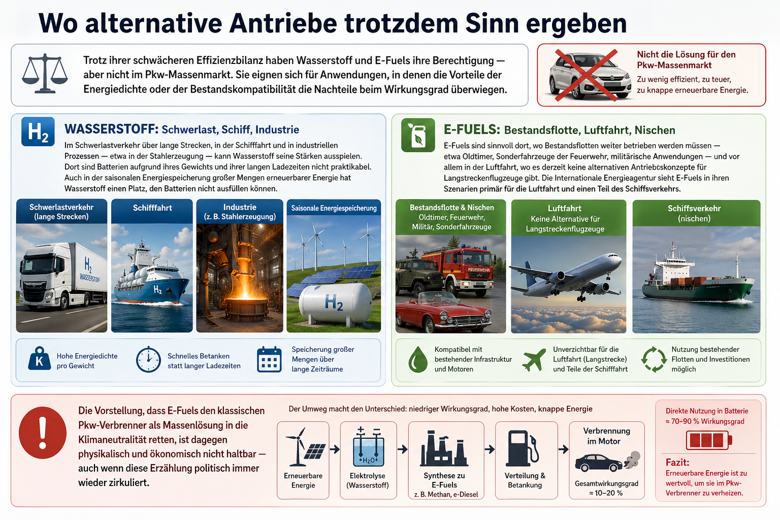 Trotz ihrer schwächeren Effizienzbilanz haben Wasserstoff und E-Fuels ihre Berechtigung — aber nicht im Pkw-Massenmarkt. Sie eignen sich für Anwendungen, in denen die Vorteile der Energiedichte oder der Bestandskompatibilität die Nachteile beim Wirkungsgrad überwiegen.