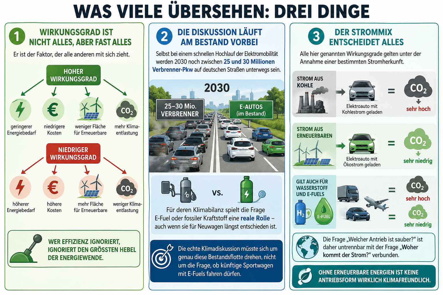 Alle hier genannten Wirkungsgrade gelten unter der Annahme einer bestimmten Stromherkunft. Ein Elektroauto, das mit Kohlestrom geladen wird, ist ökologisch deutlich schlechter als eines mit Ökostrom — der Wirkungsgrad bleibt zwar gleich, aber die CO₂-Bilanz verschiebt sich. Dasselbe gilt für Wasserstoff und E-Fuels. Die Frage „Welcher Antrieb ist sauber?“ ist daher untrennbar mit der Frage „Woher kommt der Strom?“ verbunden. Ohne erneuerbare Energien ist keine Antriebsform wirklich klimafreundlich.