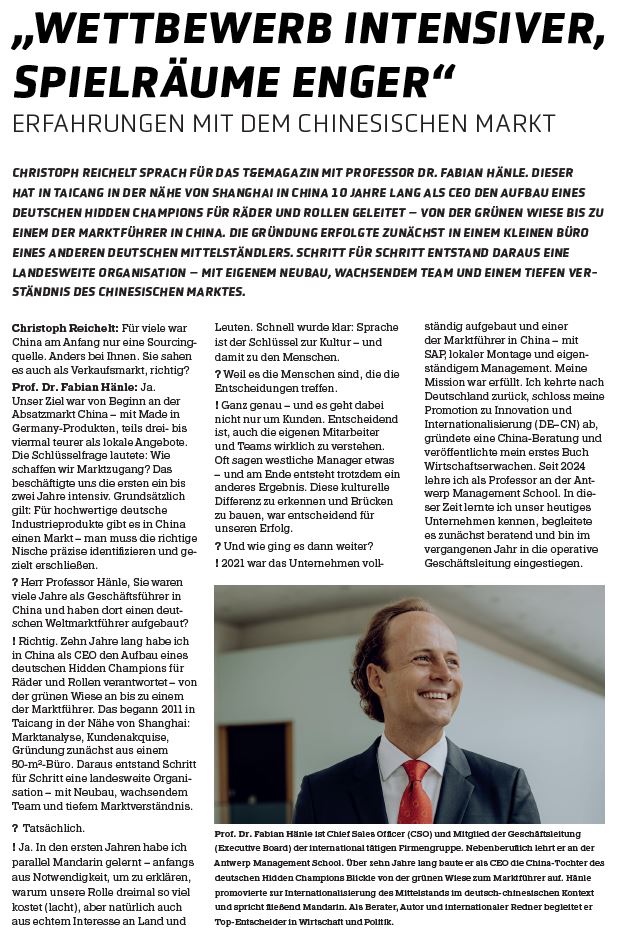 Für einen Interview in der Ausgabe 28 des T&Emagazins sprach Christoph Reichelt mit Professor Dr. Fabian Hänle. Dieser hat in Taicang in der Nähe von Shanghai in China 10 Jahre lang als CEO den Aufbau eines Deutschen “Hidden Champions” für Räder und Rollen geleitet – von der grünen Wiese bis zu einem der Marktführer in China. Die Gründung erfolgte zunächst in einem kleinen Büro eines anderen Deutschen Mittelständlers. Schritt für Schritt entstand daraus eine landesweite Organisation – mit eigenem Neubau, wachsendem Team und einem tiefen Verständnis des Chinesischen Marktes.