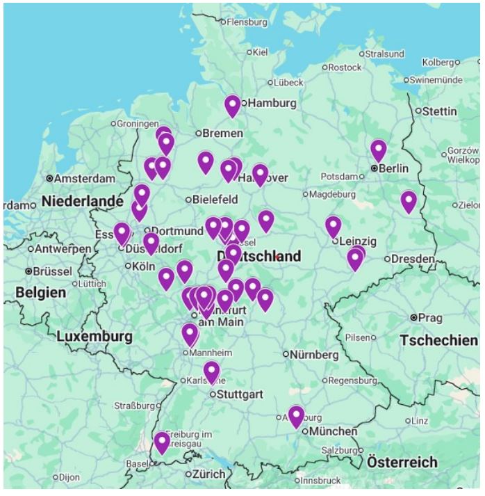 Zum Abschluss wurde nach den Postleitzahlen der Befragten geschaut, leider wollten diese nicht alle der 100 Umfrageteilnehmer mitteilen, dennoch wurde auf Basis der bekannten Adressen diese Kartenansicht entworfen.