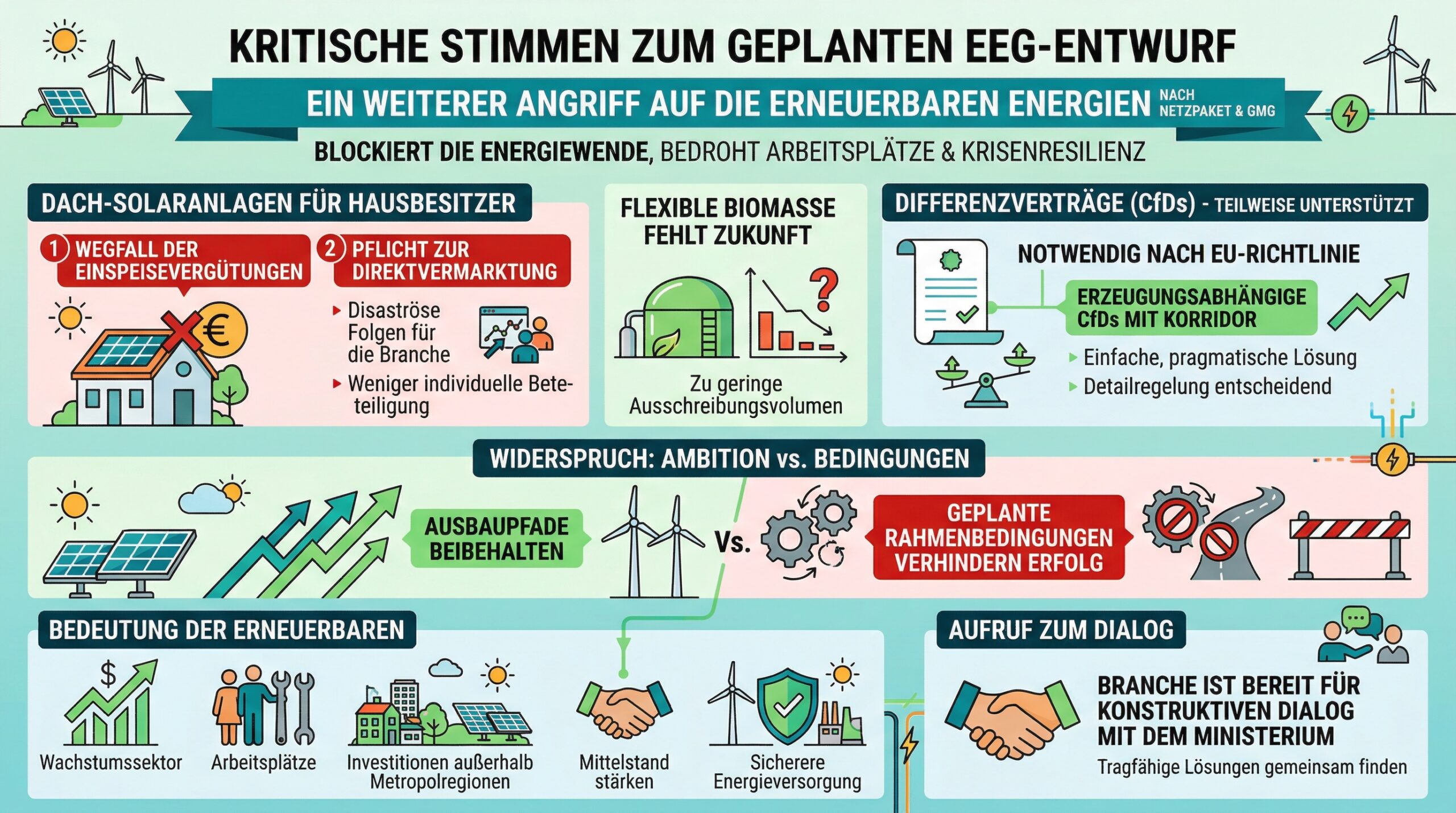 Besonders kritisch sind die vorgesehenen Regelungen zu Aufdach-Anlagen für Hausbesitzer, wie die Streichung der Einspeisevergütung und der Zwang zur Direktvermarktung. Das hätte desaströse Folgen für diese Branche, aber auch für die Beteiligungsmöglichkeiten eines jeden Einzelnen an der Energiewende. Auch die flexible Biomasse bekommt mit den zu niedrigen Ausschreibungsvolumina keine wirkliche Perspektive.