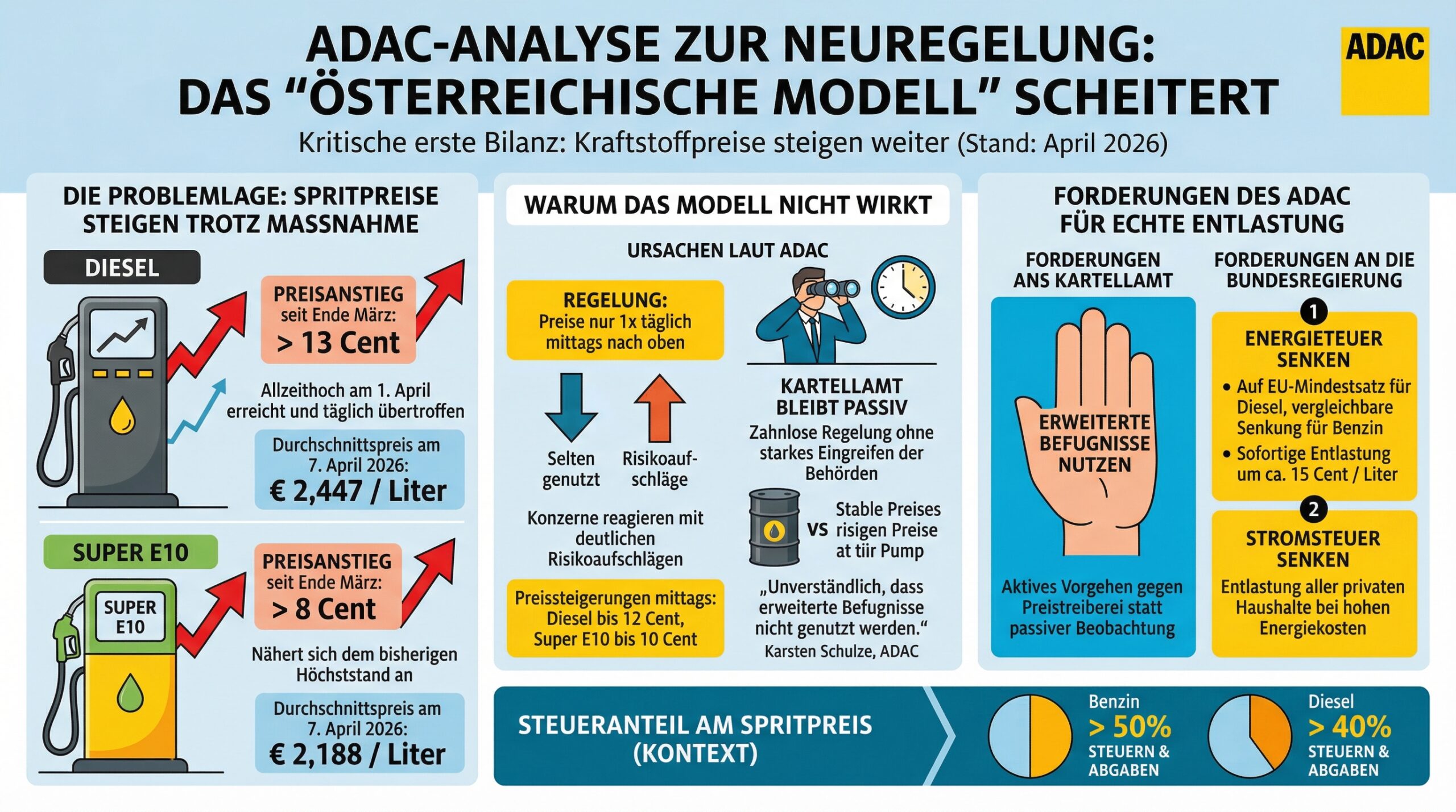 Nach Überzeugung des ADAC bleibt das Modell ohne ein hartes Eingreifen des Bundeskartellamtes sowie der Länderbehörden zahnlos. Die Befürchtungen des Mobilitätsclubs haben sich bestätigt, dass Mineralölkonzerne auf die mangelnde Flexibilität bei Preisanpassungen mit deutlichen Risikoaufschlägen reagieren. So haben diese jeweils um 12 Uhr die Spritpreise um bis zu 12 Cent bei Diesel und bis zu 10 Cent bei Super E10 angehoben, obwohl sich der Ölpreis nach wie vor auf einem ähnlichen Niveau bewegt wie vor Einführung der Neuregelung. Die Möglichkeiten, Preise jederzeit nach unten anzupassen, werden unzureichend genutzt.