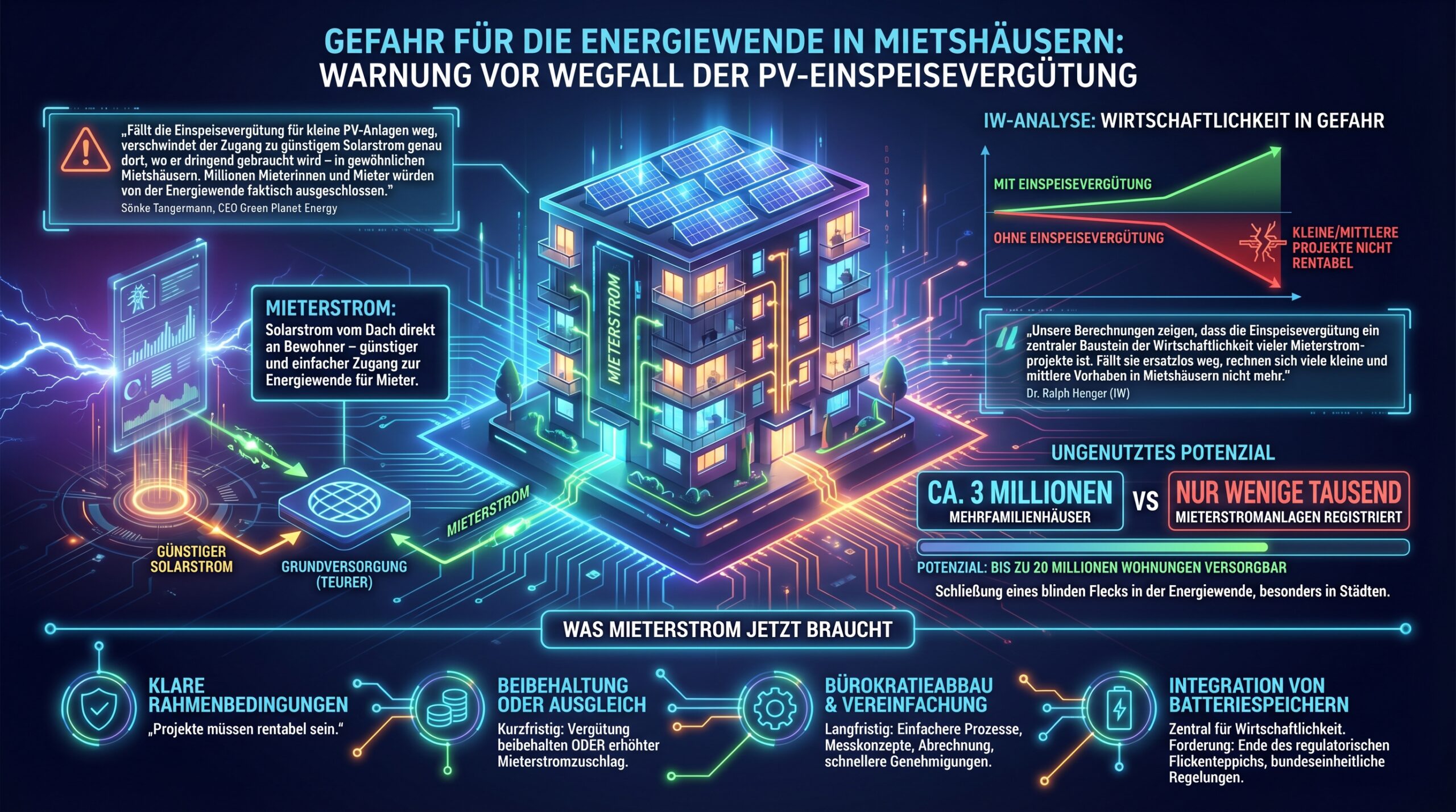 Sönke Tangermann, Vorstand von Green Planet Energy, warnt vor den Folgen: „Wenn die Einspeisevergütung für kleine PV‑Anlagen gestrichen wird, bricht ausgerechnet dort der Zugang zu günstigem Solarstrom weg, wo er dringend gebraucht wird – in ganz normalen Mehrfamilienhäusern. Millionen Mieterinnen und Mieter würden von der Energiewende faktisch ausgeschlossen.”