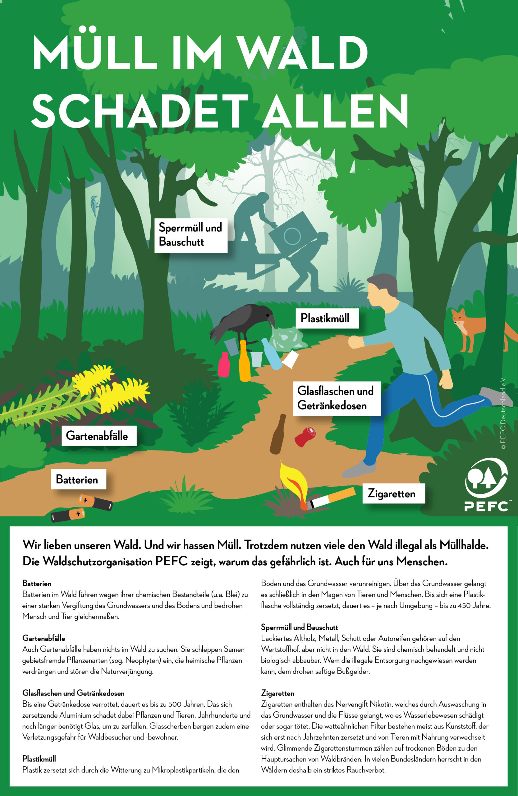 PEFC widmet sich im Bündnis mit ca. 290.000 Waldeigentümern, die ihren Wald gemäß des PEFC-Waldstandards nachhaltig bewirtschaften, der Aufklärungsarbeit. Die Menschen sollen wissen, was Müll im Wald anrichten kann. Große Gefahren gehen von Bauschutt, Batterien, Elektrogeräten und lackiertem Altholz aus. Sie enthalten chemische Giftstoffe wie Asbest, Blei, Öl oder Kühlmittel, die in den Waldboden gelangen können. Gleiches gilt für Zigarettenstummel: Sie können mehrere Tausend unterschiedliche Chemikalien und Schadstoffe freisetzen.