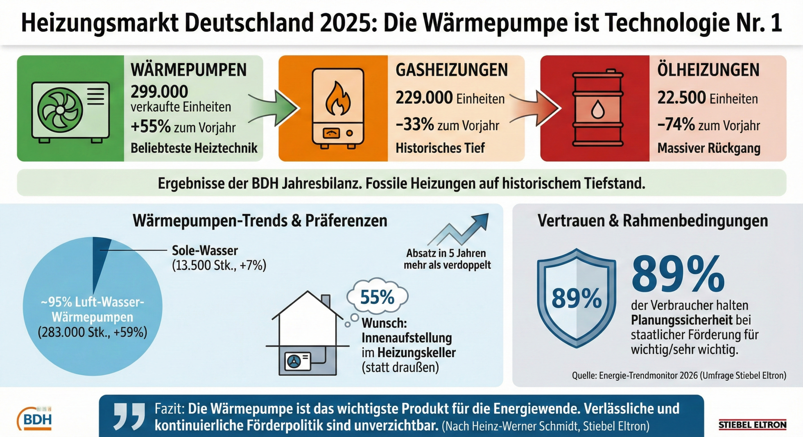 „Die Verbraucherinnen und Verbraucher haben die Wärmepumpe mit ihren Kaufentscheidungen 2025 zum wichtigsten Produkt für die Energiewende in Deutschland gemacht”, sagt Heinz-Werner Schmidt, Geschäftsführer von Stiebel Eltron. „Verlässlichkeit und Kontinuität der Förderpolitik sind unverzichtbar, um die Erfolgsgeschichte von Wettbewerbsfähigkeit und Innovation weiter fortzuschreiben.”