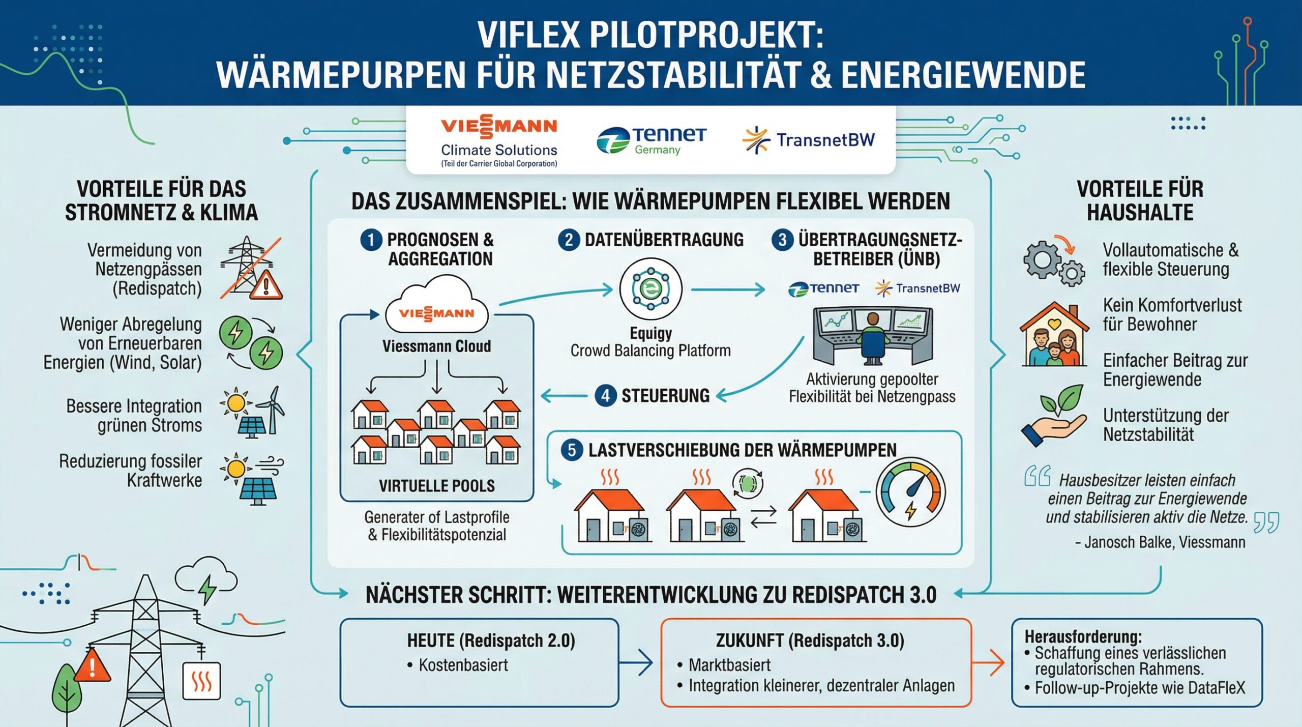Im Projekt ViFlex wurde über einen Zeitraum von fast drei Jahren erstmals getestet, wie sich Wärmepumpen im realen Betrieb technisch in das Engpassmanagement der Übertragungsnetzbetreiber einbinden lassen. Dafür wurden die Wärmepumpen der am Pilotprojekt teilnehmenden Haushalte über die Viessmann-Cloud für einzelne Netzgebiete zu virtuellen Pools aggregiert und eine Prognose der Lastverläufe sowie Flexibilitätspotenziale über die Equigy-Crowd-Balancing-Plattform an die Übertragungsnetzbetreiber übermittelt.
