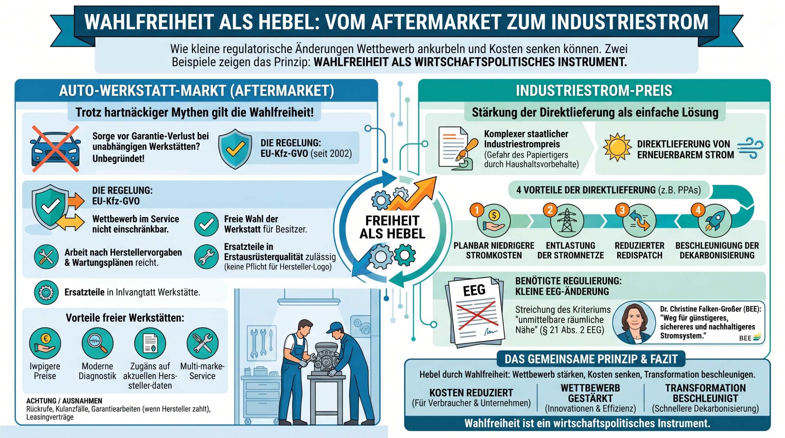 Die Lehre ist einfach: Wahlfreiheit ist kein Verbraucherschutz-Beiwerk, sondern ein wirtschaftspolitisches Werkzeug. Sie senkt Kosten, stärkt den Wettbewerb und beschleunigt die Transformation – ob beim nächsten Inspektionstermin oder beim Stromtarif einer Fabrik.