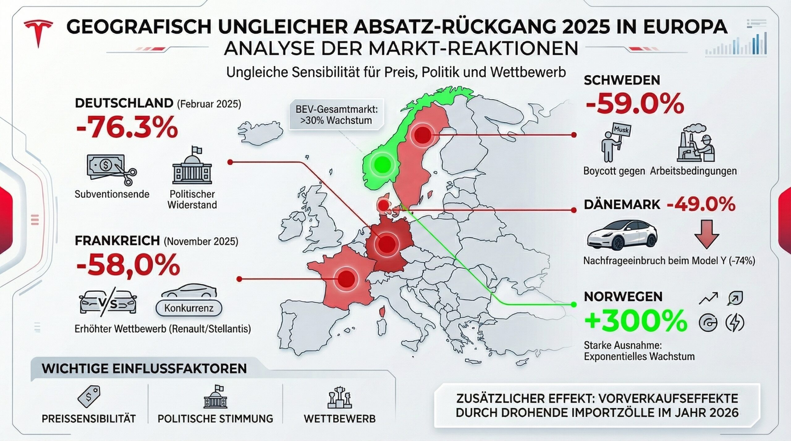 Der Rückgang im Jahr 2025 war geografisch ungleich verteilt, was auf die unterschiedliche Sensibilität der Märkte gegenüber Preisänderungen, politischer Stimmung und Wettbewerb hindeutet. In Deutschland, einem der wichtigsten Märkte, brachen die Neuzulassungen im Februar 2025 um 76,3 % ein, während der Gesamtmarkt für batterieelektrische Fahrzeuge (BEV) im gleichen Zeitraum um über 30 % wuchs. Ähnlich dramatische Szenen spielten sich in Frankreich (-58 % im November 2025) und Dänemark (-49 %) ab.