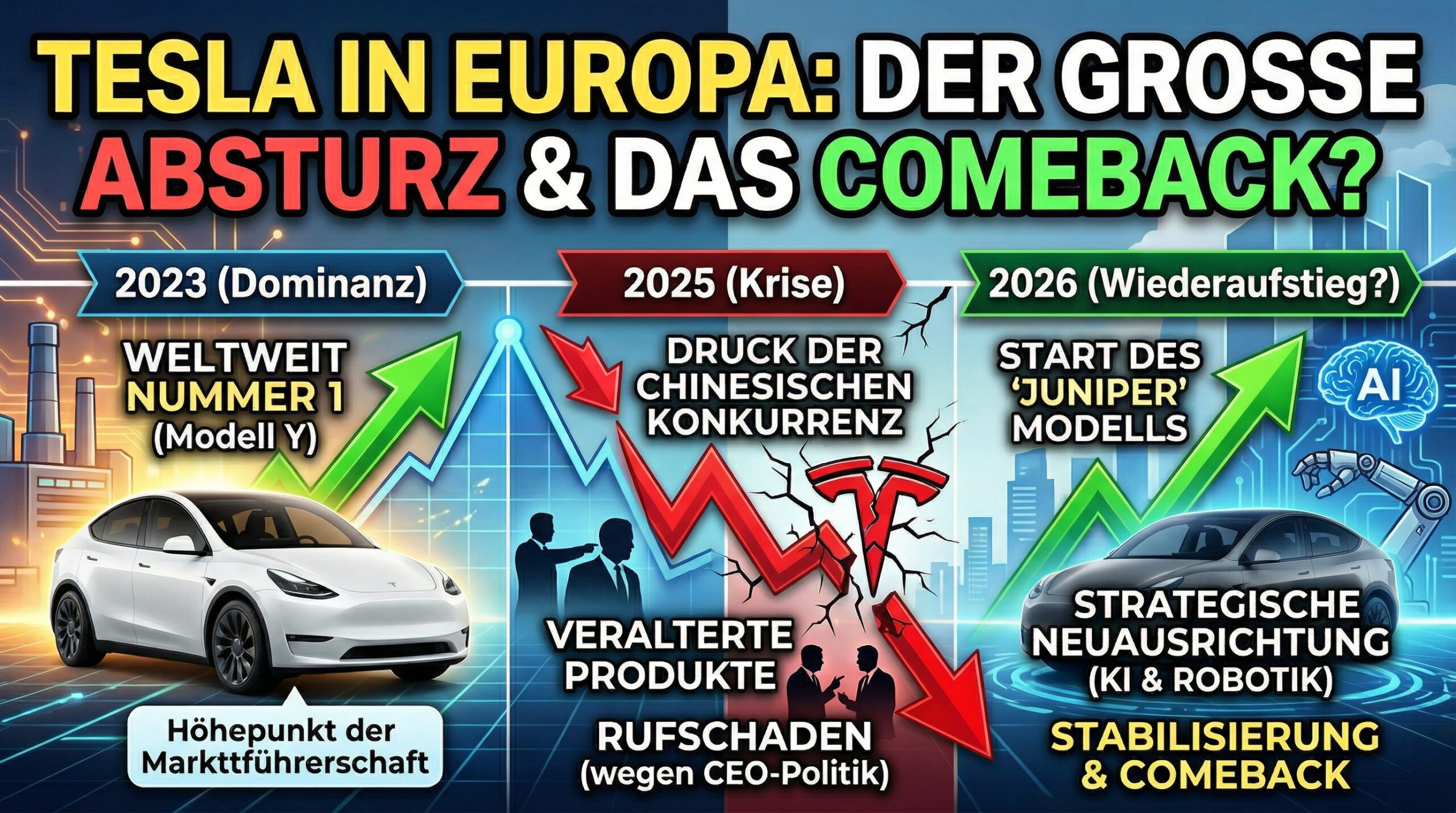 Die Entwicklung des US-amerikanischen Elektrofahrzeug-Pioniers Tesla auf dem europäischen Kontinent zwischen den Jahren 2023 und 2026 stellt eine der komplexesten Fallstudien der modernen Industriegeschichte dar. Während das Unternehmen im Jahr 2023 mit dem Model Y das weltweit meistverkaufte Fahrzeug stellte und eine beispiellose Dominanz ausübte, markierte das Jahr 2025 einen dramatischen Wendepunkt, der in Fachkreisen oft als “Absturz” tituliert wurde. Die Gründe hierfür sind polykausal und reichen von einer alternden Produktpalette über massiven Wettbewerbsdruck aus China bis hin zu einer tiefgreifenden Erosion des Markenimages, die untrennbar mit der politischen Polarisierung durch den CEO Elon Musk verknüpft ist. Zu Beginn des Jahres 2026 zeichnet sich jedoch eine Stabilisierung und ein beginnendes “Comeback” ab, das maßgeblich durch die Einführung des überarbeiteten Model Y (Codename “Juniper”) und eine radikale strategische Neuausrichtung hin zu Künstlicher Intelligenz und Robotik getrieben wird.