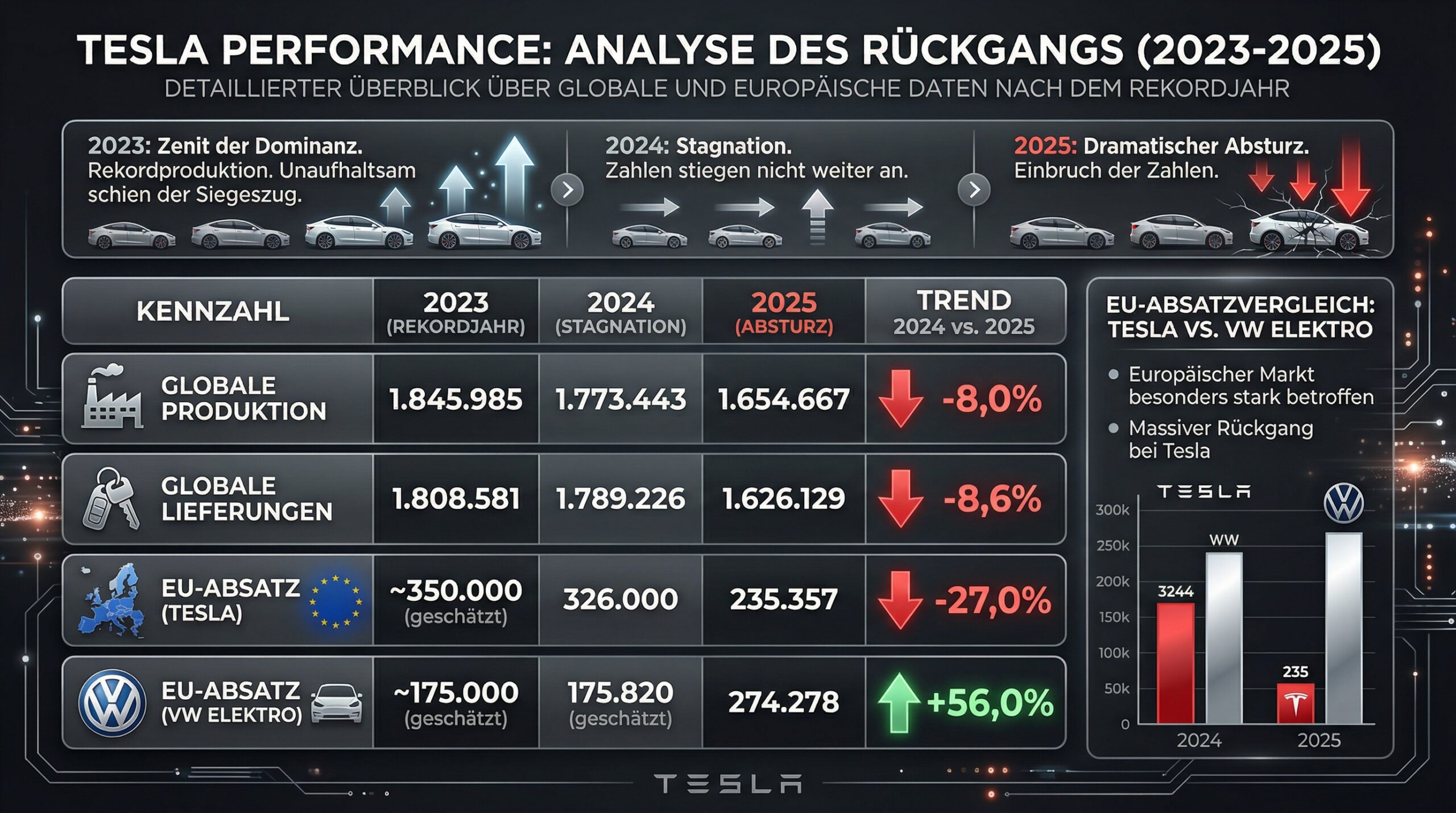 Um die Tiefe des Falls zu verstehen, ist eine detaillierte Betrachtung der Auslieferungs- und Produktionsdaten unerlässlich. Das Jahr 2023 markierte den Zenit der Tesla-Dominanz in Europa. Mit einer weltweiten Produktion von über 1,8 Millionen Fahrzeugen schien der Siegeszug unaufhaltsam. Doch bereits 2024 stagnierten die Zahlen, und 2025 folgte der Einbruch. Die globale Produktion sank auf etwa 1,65 Millionen Einheiten, was einem Rückgang von 8 % gegenüber 2024 entspricht. Besonders drastisch traf es den europäischen Markt, wo die Verkaufszahlen von 326.000 Einheiten im Jahr 2024 auf nur noch rund 235.000 Einheiten im Jahr 2025 fielen.
