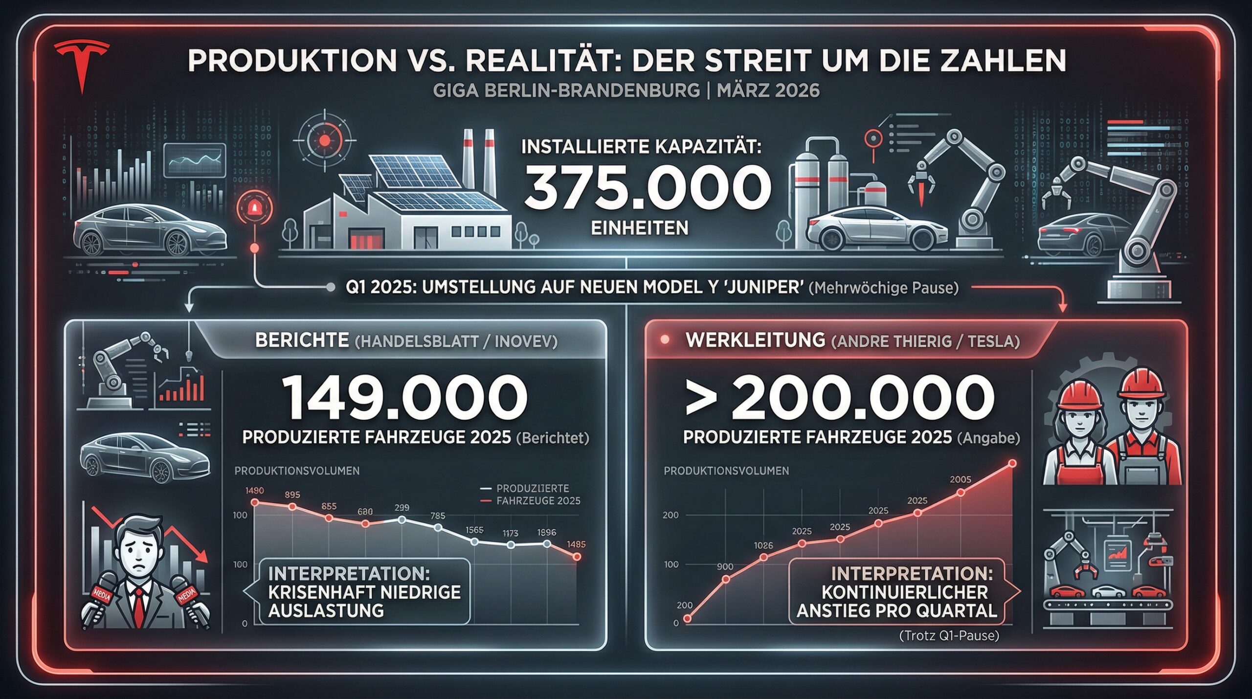 Im März 2026 eskalierte ein öffentlicher Streit zwischen der Werksleitung und Medienvertretern. Während das Handelsblatt unter Berufung auf Marktforscher von nur 149.000 produzierten Fahrzeugen im Jahr 2025 sprach, konterte Werksleiter Andre Thierig scharf. Er gab an, dass die Produktion tatsächlich über 200.000 Einheiten gelegen habe, trotz einer mehrwöchigen Pause im ersten Quartal 2025 zur Umstellung der Fertigungslinien auf das neue Model Y Juniper.