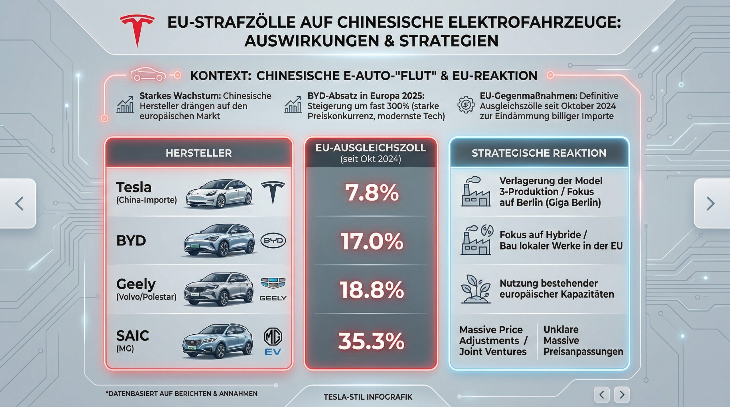 Diese Zölle verschafften Tesla paradoxerweise einen relativen Vorteil. Da das Model Y für Europa überwiegend in Berlin produziert wird, ist es von diesen Zöllen nicht betroffen. Für das aus Shanghai importierte Model 3 profitierte Tesla zudem von einem individuell ausgehandelten, niedrigen Zollsatz von 7,8 %, während Konkurrenten wie SAIC mit über 35 % belegt wurden. Dennoch verteuerte sich das Einstiegsmodell Model 3 spürbar, was zu einem Absatzeinbruch in diesem Segment beitrug.