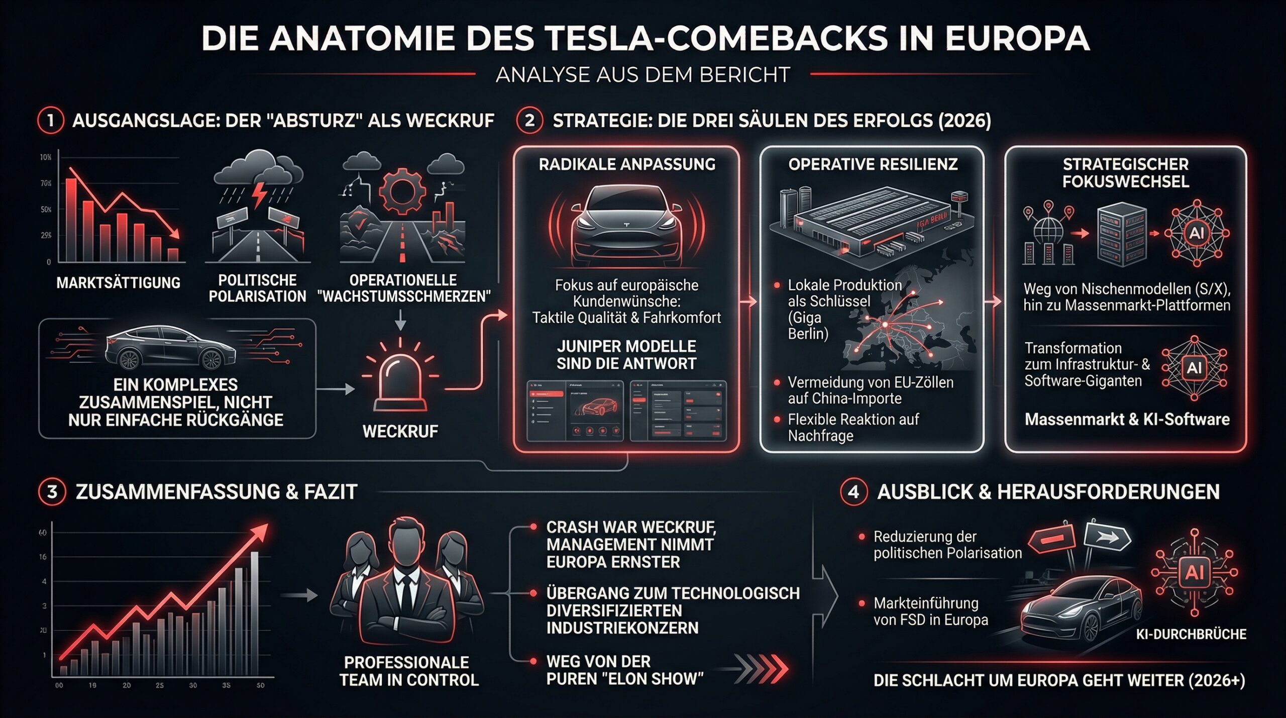 Zusammenfassend lässt sich festhalten: Der “Absturz” war ein Warnschuss, der das Management dazu zwang, den europäischen Markt ernster zu nehmen. Das “Comeback” 2026 ist das Ergebnis einer Professionalisierung, die Tesla weg von der reinen “Elon-Show” hin zu einem technologisch diversifizierten Industriekonzern führt. Ob dieses Momentum nachhaltig ist, wird maßgeblich davon abhängen, ob es gelingt, die politische Polarisierung der Marke weiter abzubauen und die versprochenen KI-Durchbrüche (FSD) tatsächlich auf europäische Straßen zu bringen. Der Kampf um die Vorherrschaft in der europäischen Elektro-Mobilität ist im Jahr 2026 in eine neue, noch intensivere Phase eingetreten.