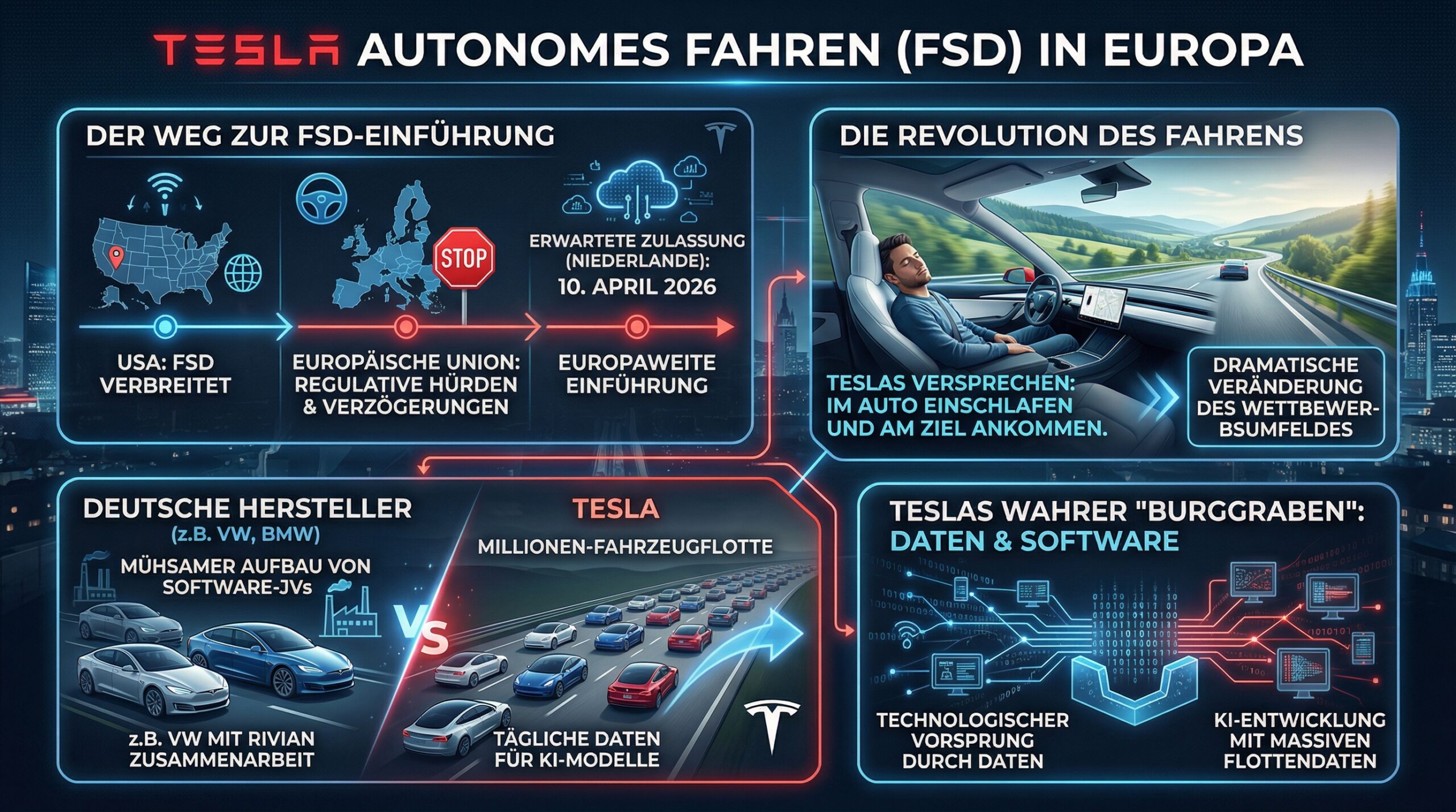 Sollte Tesla sein Versprechen einlösen, dass Besitzer eines Tesla “im Auto einschlafen und am Ziel ankommen können”, würde dies die Wettbewerbslage in Europa schlagartig verändern. Während deutsche Hersteller wie VW oder BMW erst mühsam Software-Joint-Venture (z. B. VW mit Rivian) aufbauen, verfügt Tesla bereits über eine Flotte von Millionen Fahrzeugen, die täglich Daten für die KI-Modelle liefern. Dieser technologische Vorsprung in der Software-Ebene wird von Investoren als der wahre “Burggraben” von Tesla angesehen.